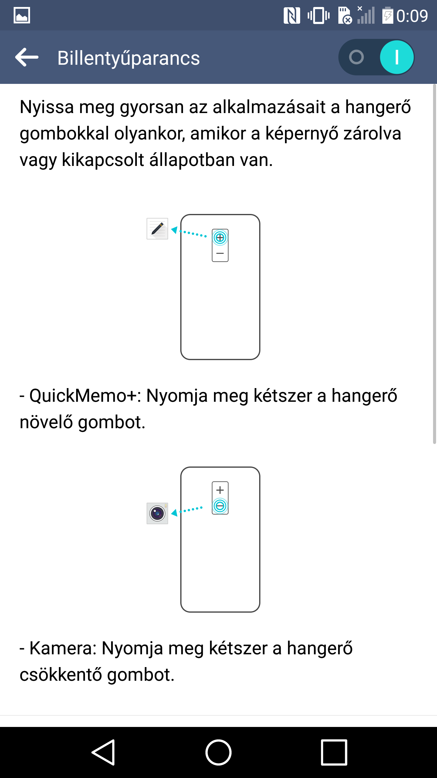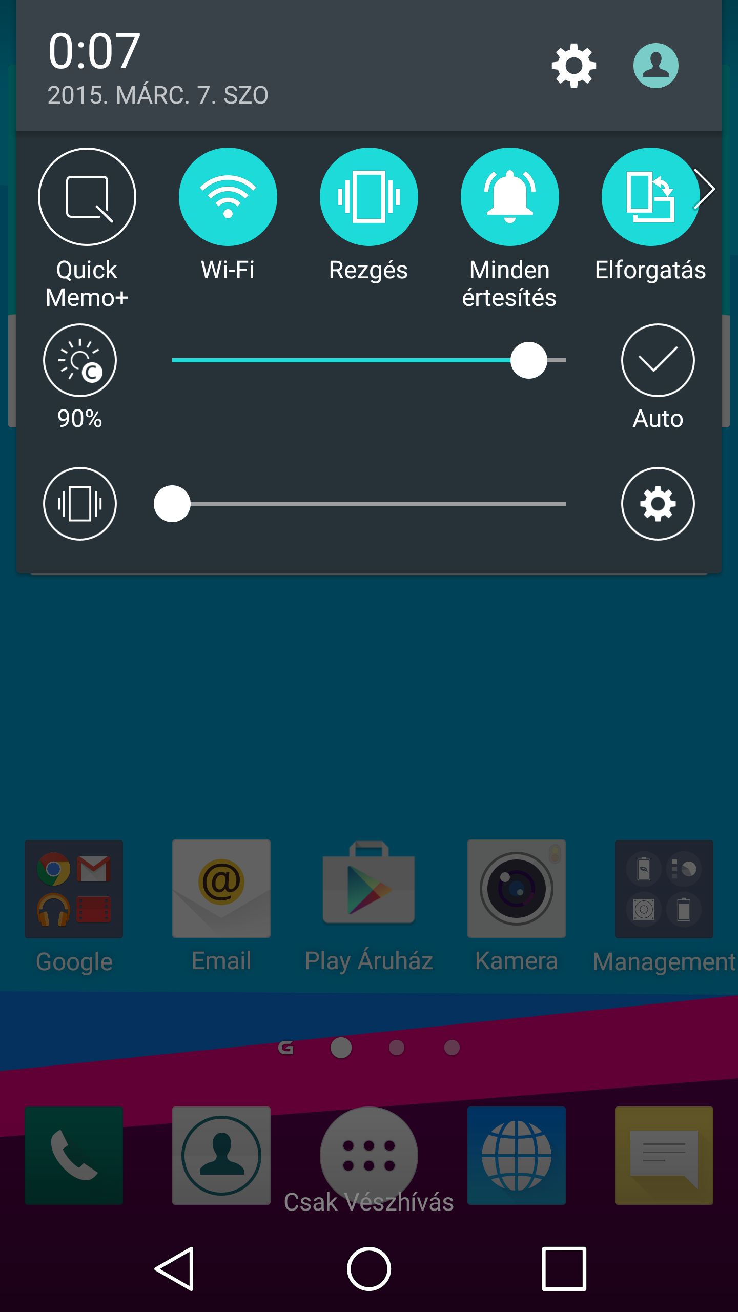 A lezáró képernyő alapesetben csak órát és esetleg néhány státuszüzenetet tartalmaz, extra indítási lehetőség, pl. fényképező, nincsen rajta, viszont ez utólag bekapcsolható. Az LG-nél eddig szokásos sima, jelszavas és mintás megoldások mellett a tavalyi Mobile World Congressen bemutatkozó Knock Code is használható a kijelző feloldására, vagyis a bekapcsoló gomb helyett a kijelzőt is kopogtathatjuk. Az NC a jelszót is helyettesíti, a dupla koppintás viszont csak a kijelzőt kapcsolja be (épp úgy, mintha megnyomtuk volna a bekapcsoló gombot). A Knock Code nekünk nagyon tetszett, a G4-ben viszont már nemcsak a telefon feloldása lett sokkal egyszerűbb, hanem az értesítések megnézése is: lezárt képernyő mellett egy, a kijelző felső éléről indított simítással minden további nélkül le tudjuk húzni az értesítési sávot – ennél gyorsabb az értesítések kezelése alighanem sose lesz. Lezárt telefonnál a hangerőszabályzók gyorsgombként szolgálnak: mindkettőhöz egy alkalmazást rendelhetünk, amelyet a gomb nyomva tartásával indíthatunk el.
