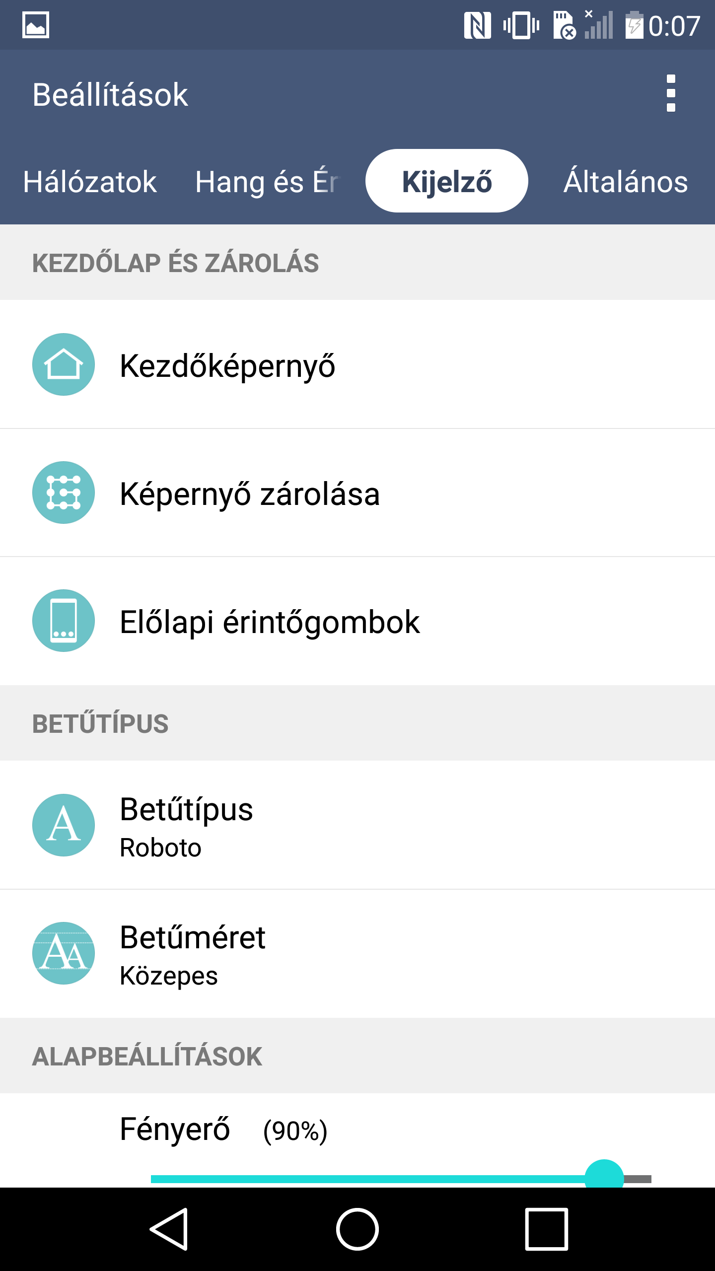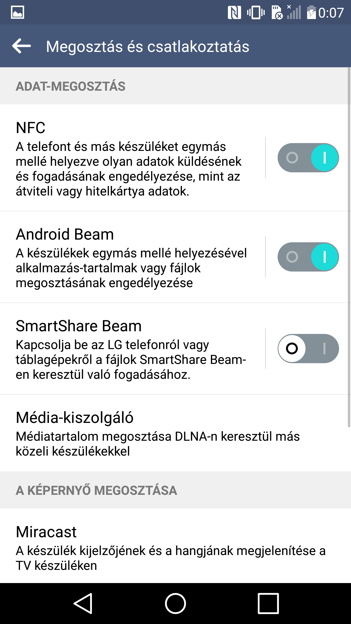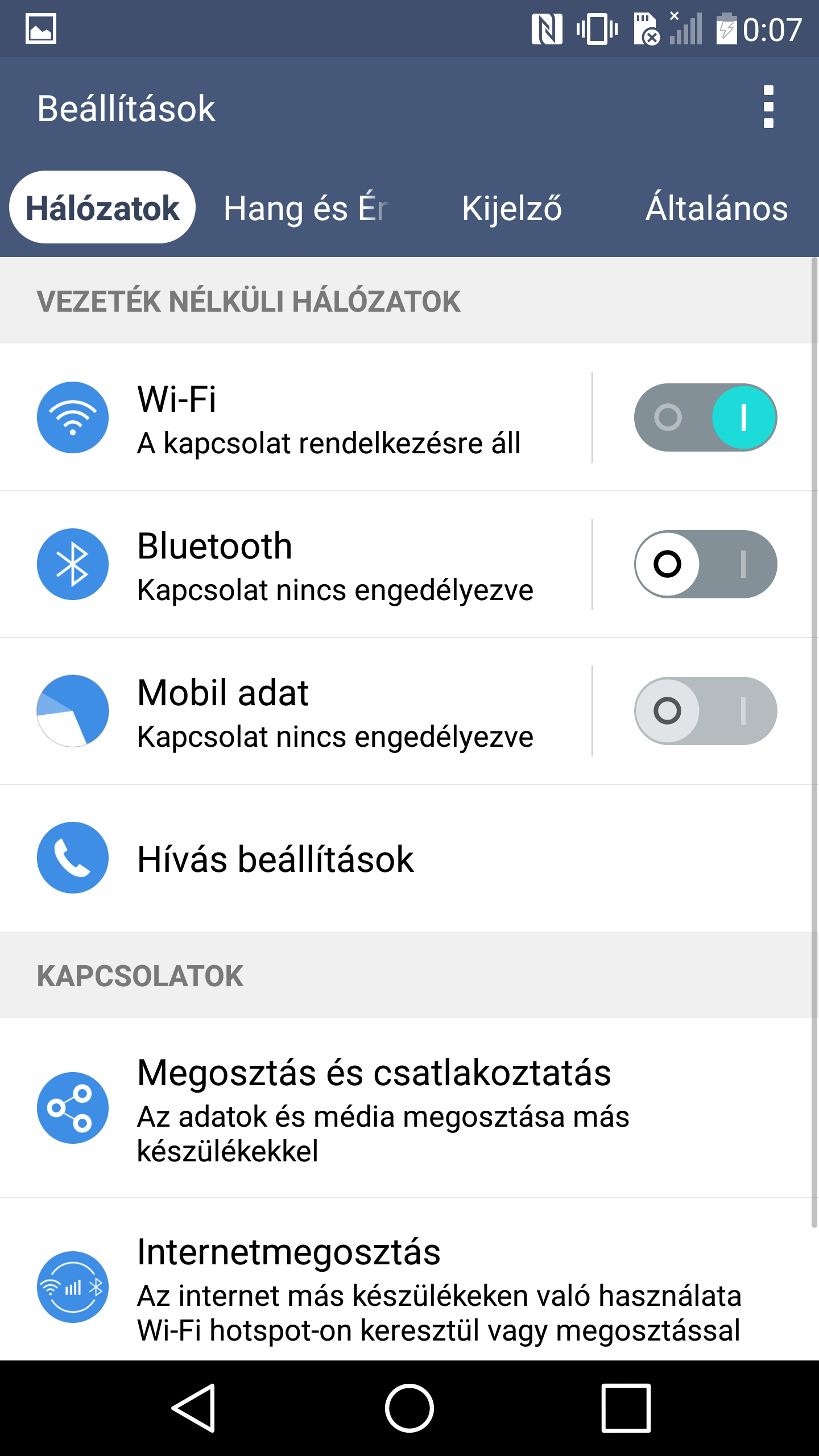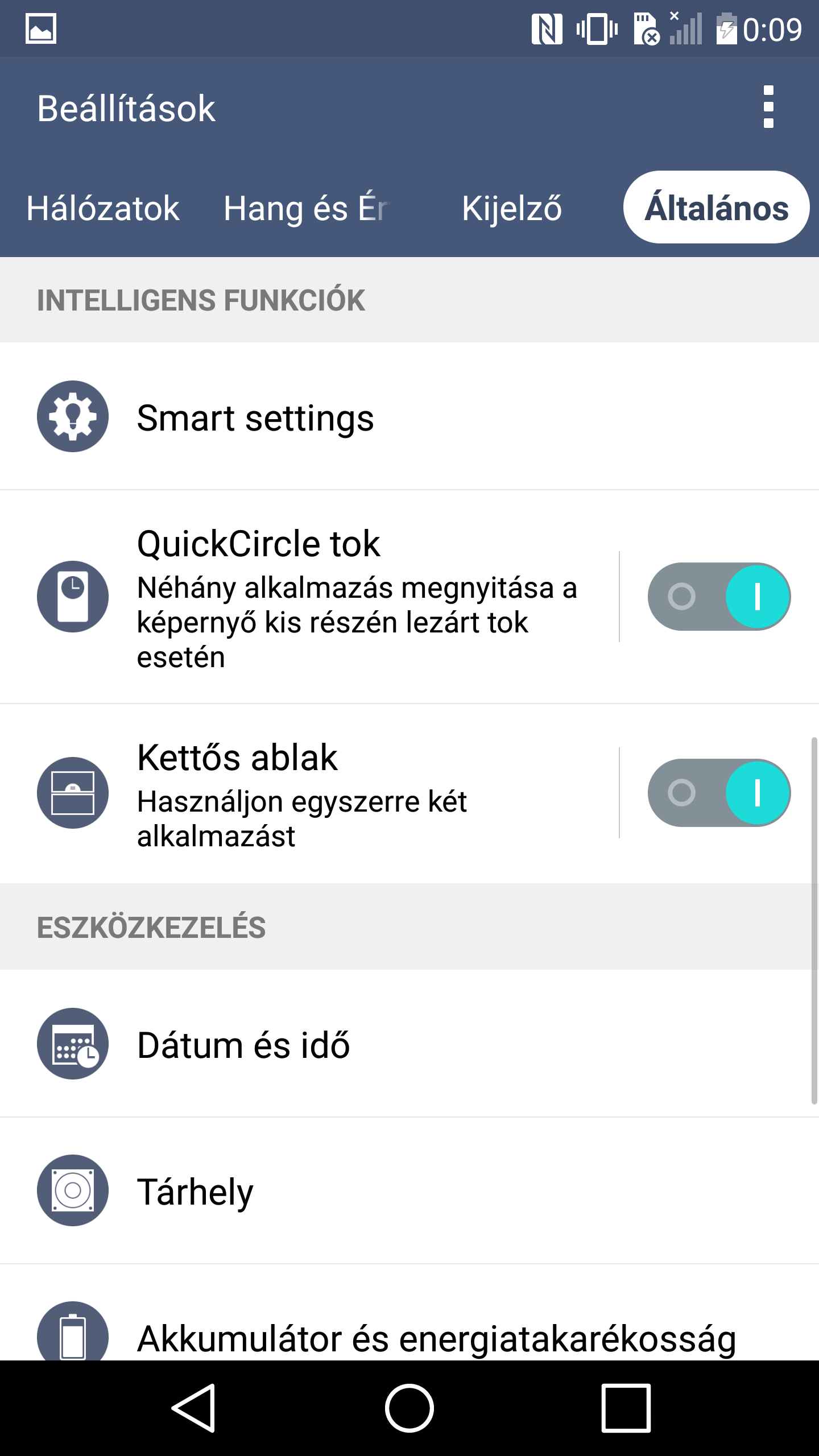 A menüt az LG szétszedte, négy csoportra: a Hálózatok, Hang, Kijelző és Általános csoportok között jobbra-balra mozogva tudunk navigálni. Az opciók elrendezése logikus, az összes megosztási és kommunikációs megoldás (DLAN, SmartShare Beam, Android Beam, FC, MiraCast, LG PC Suite) a hálózatok menübe került például. Sajnos az állapotsáv nem változott, így szerintünk még mindig túlságosan zsúfolt.