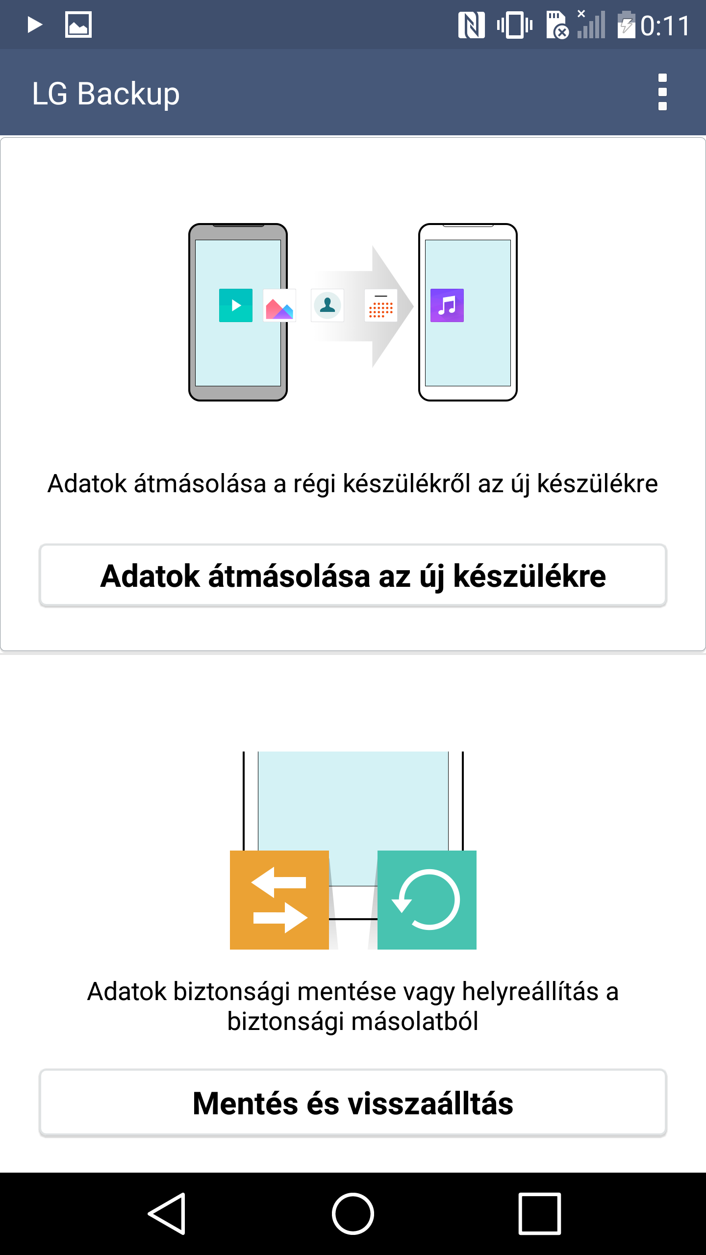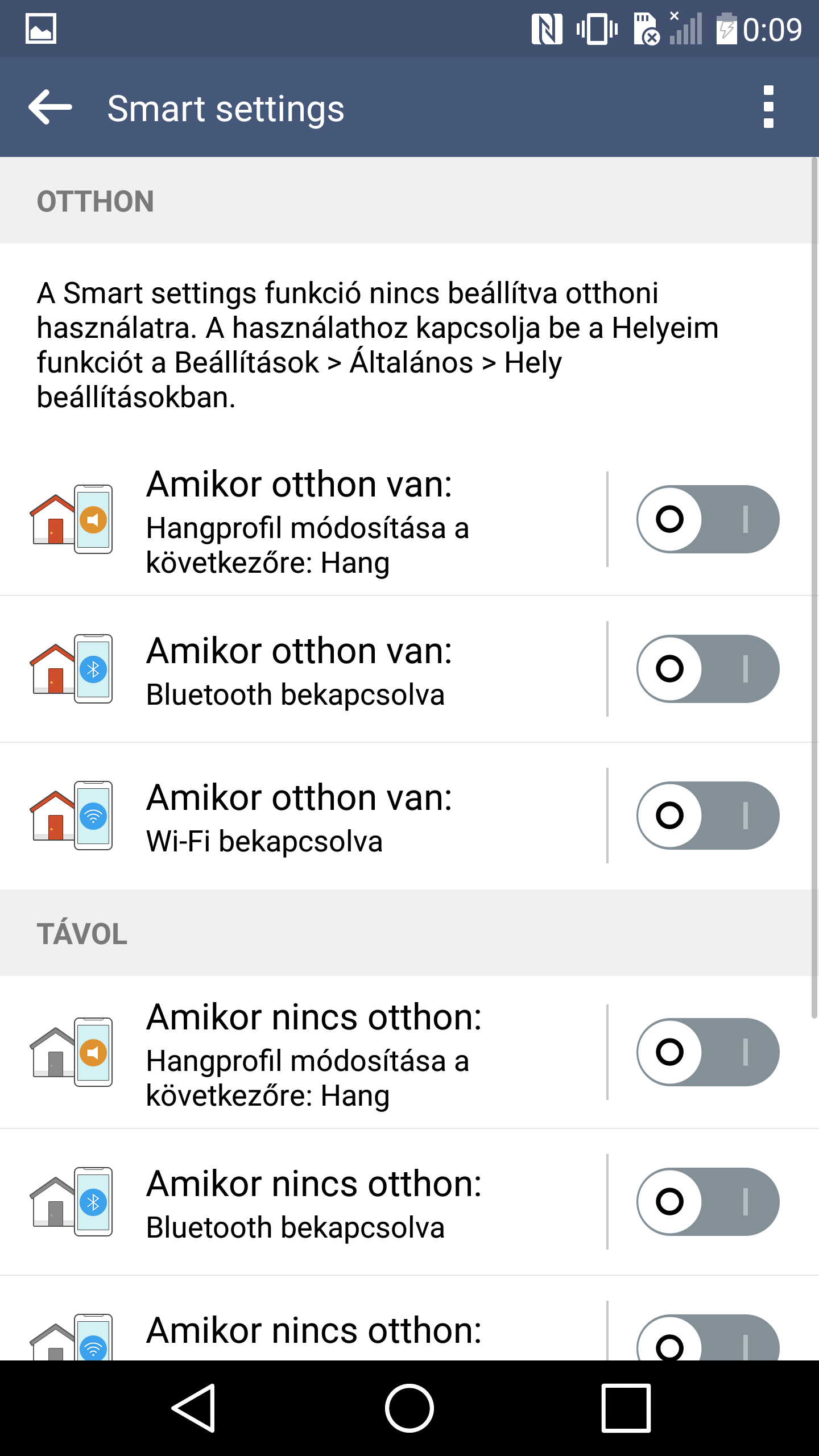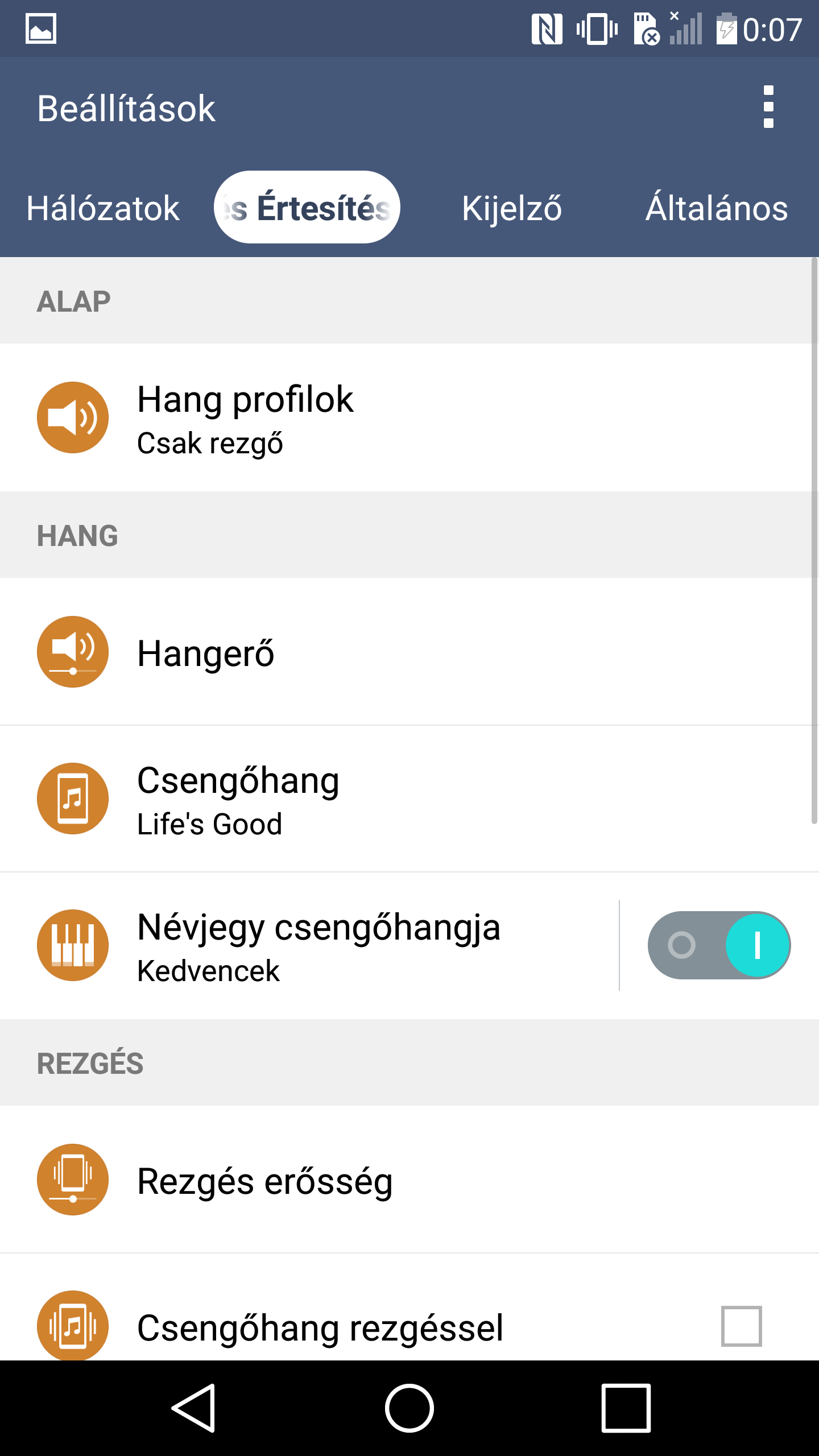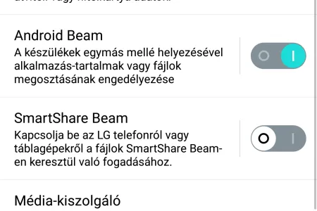 A menüt az LG szétszedte, négy csoportra: a Hálózatok, Hang, Kijelző és Általános csoportok között jobbra-balra mozogva tudunk navigálni. Az opciók elrendezése logikus, az összes megosztási és kommunikációs megoldás (DLAN, SmartShare Beam, Android Beam, FC, MiraCast, LG PC Suite) a hálózatok menübe került például. Sajnos az állapotsáv nem változott, így szerintünk még mindig túlságosan zsúfolt.