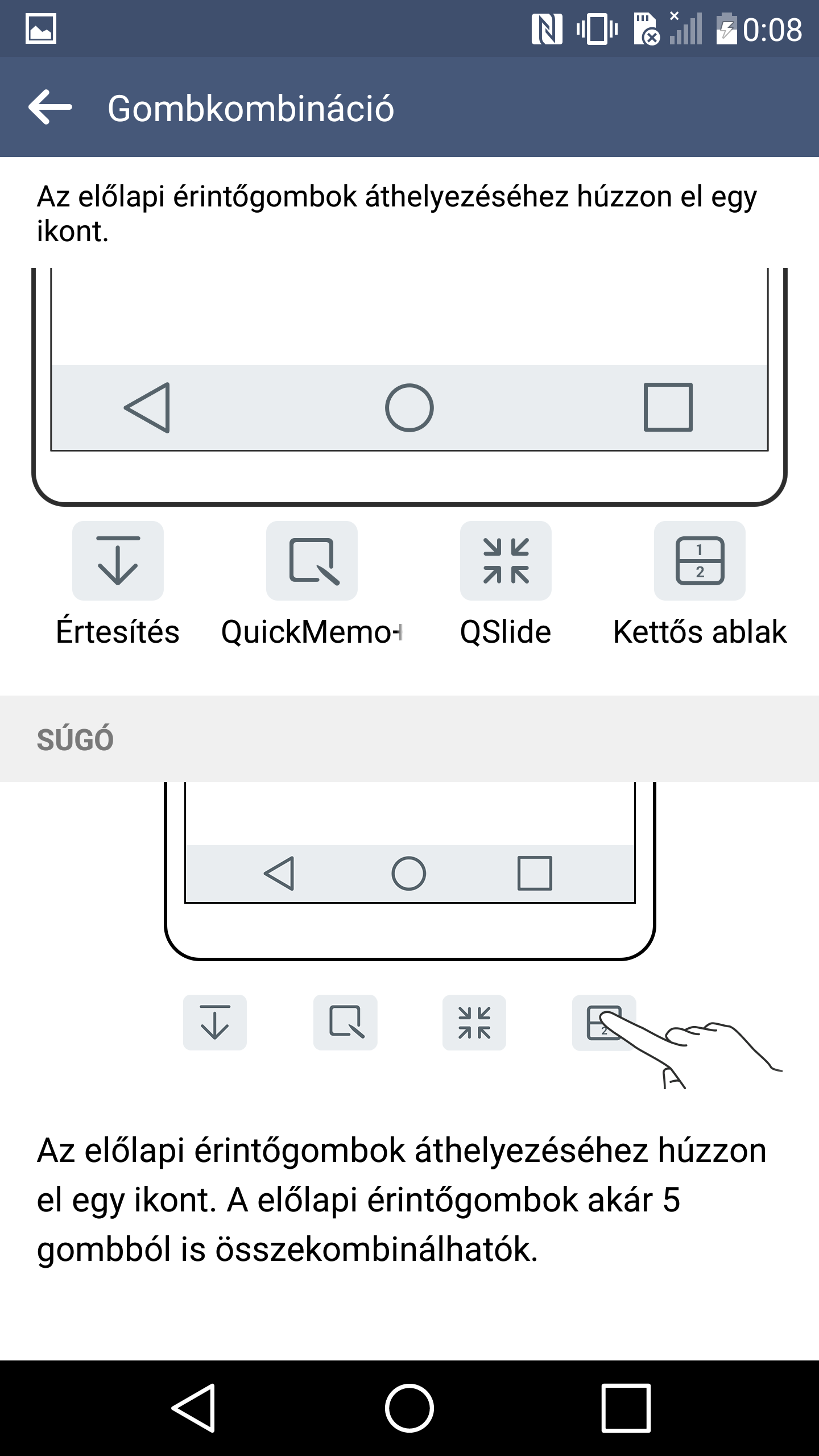 Az LG G4-en az Android 5.1-es verziója fut, de ebből persze megint nem sok látszik, mivel a telefonra a koreai gyártó mérnökei az Optimus UI 4-es változatát is felrakták. A kezelőfelület ebből adódóan nagyvonalakban egyezik azzal, mint ami az LG G3-ra is elérhető – persze csak a legfrissebb változatra gondolunk, nem az Android 4.4+Optimus UI 3 párosra, amellyel a G3 anno piacra került. A felhasználói felület legújabb verziója természetesen már az Android 5-ös verziójával bevezetett dizájnelvekhez igazodik, és nagyon sok apró részletében megújult. Ilyen például a szoftveres vezérlősáv, amelyen az LG korábban alkalmazott vissza, Home és feladatkezelő piktogramjai helyett a háromszög-kör-négyzet hármast kapjuk. Viszont ezzel együtt a totális testreszabhatóság is megmaradt, hogy még mindig a gomboknál maradjunk, a vezérlő sávban akár öt funkciógombnak is szoríthatunk helyet: az értesítések, QuickMemo+, QSlide és Kettős ablak módok pakolhatók még be ide.