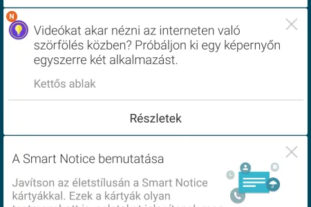 A widgetek közül érdemes kiemelni a Smart Notice felületet, amely legördülő kártyácskákon tud jelezni néhány fontos üzenetet. Például születésnapokat, ha pedig volt egy nem fogadott hívásunk, akkor később figyelmeztet, hogy hívjuk vissza az illetőt. Megjelenhetnek itt a Smart Bulletin üzenetei is valamint a telefon karbantartását elősegítendő emlékeztetők (pl. letöltött fájlok törlése, stb.).
