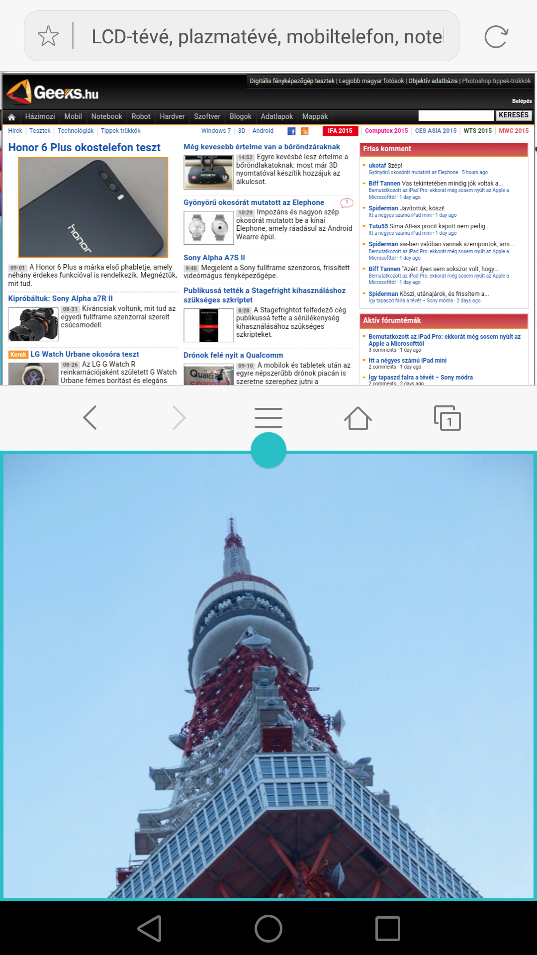 Böngészni sem csak a Chrome-mal lehet, hanem a „sima” Böngészővel, amely sebességben picit lassabb, viszont sokkal részletesebben beállítható a működése, és gyorsabban kapcsolhatjuk ki benne a kép nélkül, az inkognitó és az asztali módokat is. Hasznos továbbá az offline mentés lehetősége, és az is, hogy az alapértelmezett betűméret növelhető. Az internetezés élménye a Chrome-mal és a Böngészővel is nagyon jó, a Kirin 935 villámgyorsan dobálja fel az összetettebb weboldalalkat is, az 5,5 colos méret pedig elég nagy felületet biztosít.