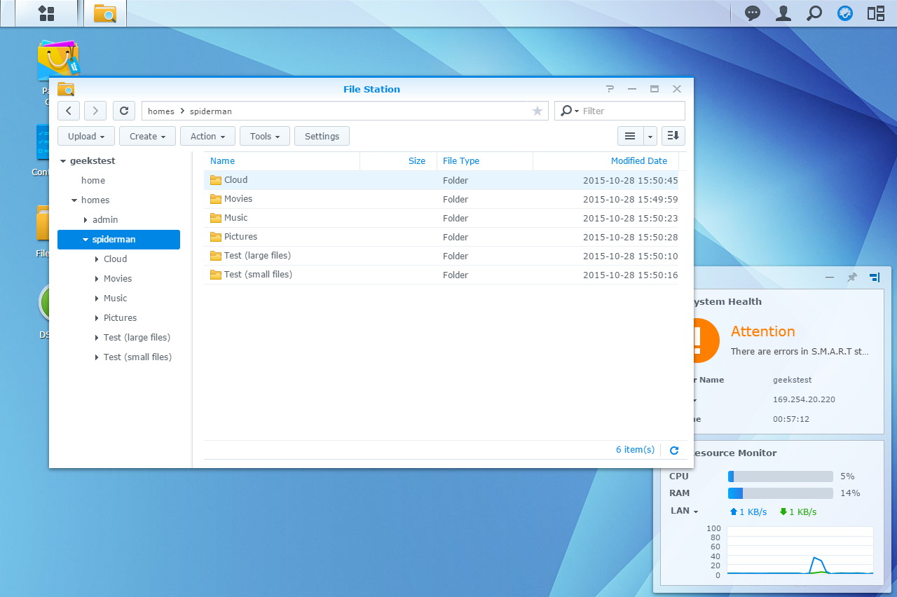 A Synology DS216play kezelőfelületét a Synology Assistant segítségével vagy a NAS IP-címének segítségével érhetjük el. Aki ismeri a DSM-et, annak természetesen sok újdonsággal a felépítést illetően nem tudunk szolgálni, de az újak kedvéért röviden elmondjuk, hogy a DSM külső jegyei alapján is úgy néz ki, mint egy operációs rendszer: futtatható alkalmazásokkal, rendszermonitorral, egymás mellett ablakban megjelenő szolgáltatásokkal. Nagyon könnyű eligazodni benne, akár Windowshoz akár Linuxhoz szokott valaki. A beállítási lehetőségek tárháza széles, sok apróságot lehet beállítani – többek között azt is, hogy a merevlemezek mennyi készenléti idő után tartsanak pihenőt. A DSM természetesen saját tűzfallal is rendelkezik, és hasznos funkció benne, hogy a fontosabb értesítéseket, riasztásokat SMS-ben vagy Skype-on is el tudja küldeni.