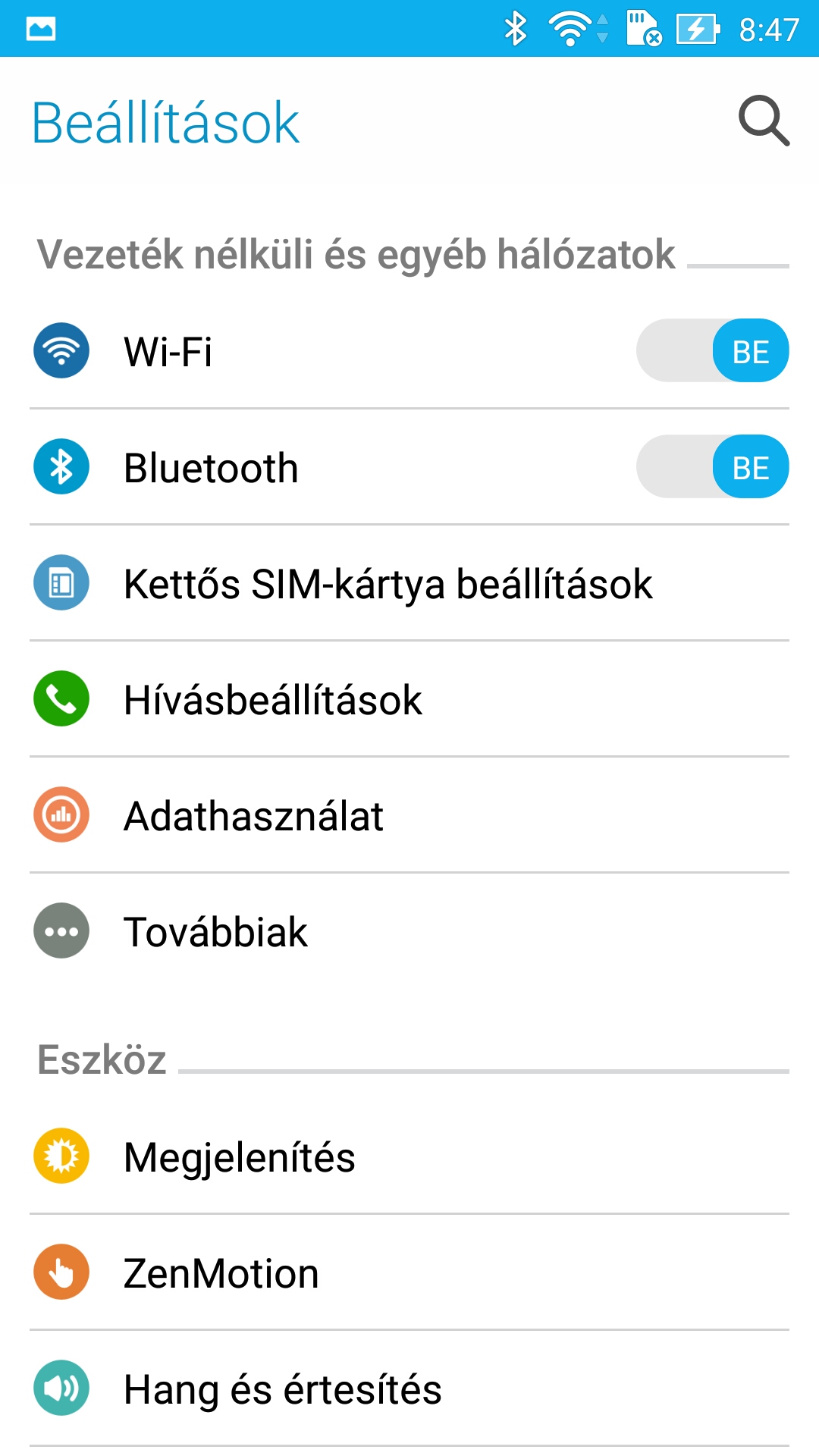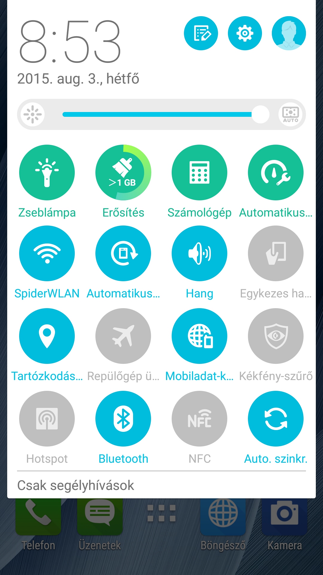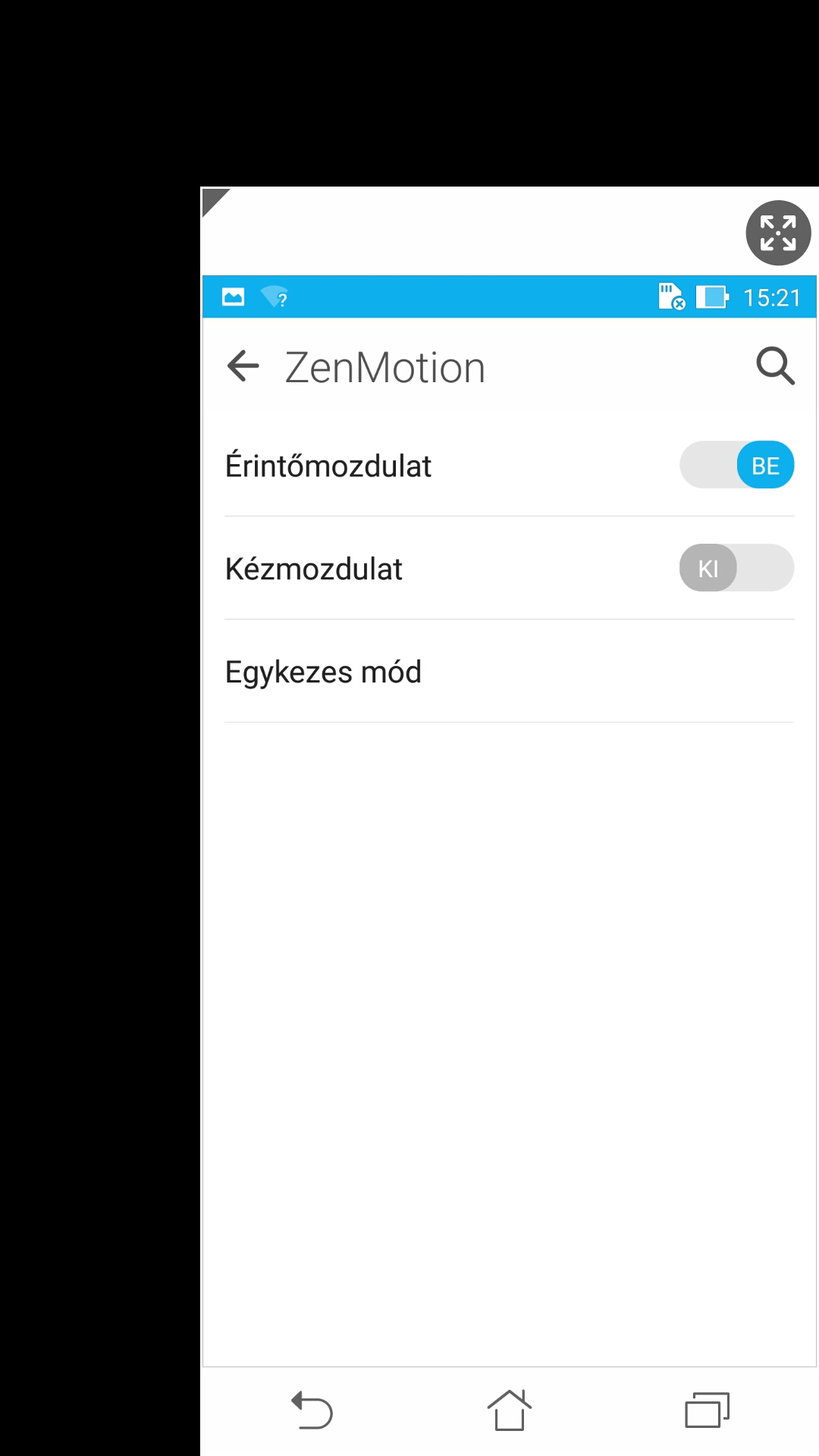 A menü átrendezésével viszont már nem sokat bajlódtak az ASUS-nál, de természetesen a lehetőségek tárháza kiegészült néhány egyedi funkcióval is. A két SIM kezeléséhez például külön menü van, a kijelző beállítási lehetőségi között pedig színhőmérséklet is megjelent. A ZenMotion menüben néhány gesztust engedélyezhetünk, illetve ide került az egykezes mód is: engedélyezés után a Home gomb dupla érintésével tudjuk kisebb méretűvé varázsolni a kijelzőt, hogy egy ujjal is kényelmesen átérjük a tartalmát.