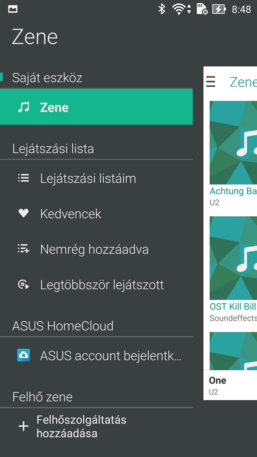 Zene fronton egyrészt ott van a Play Zene másrészt az ASUS saját alkalmazása is, a Zene. Ez utóbbi talán jobb egy fokkal, de csak azért, mert Drive, ASUS WebStorage, Dropbox valamint OneDrive tárhelyről is le tudja játszani a zenéinket. EQ, keresés és rendezési szempontok mindkét appban megtalálhatók.