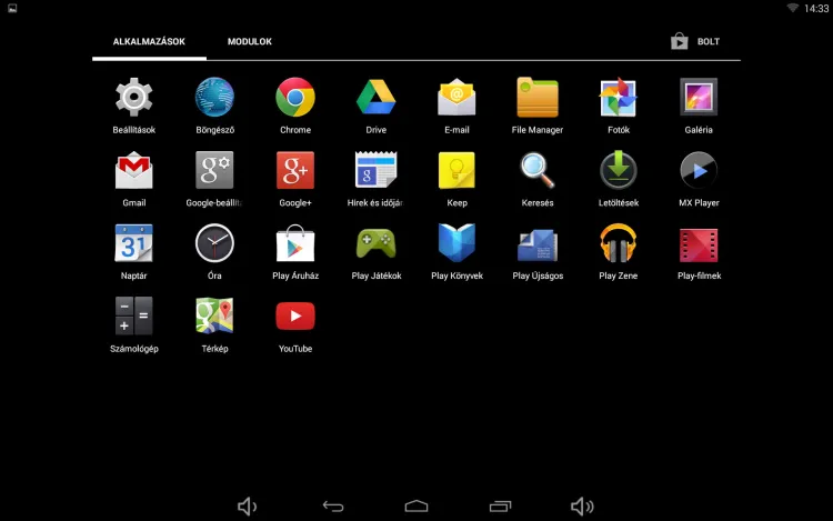 Akinek jobban bejön az Android, az választhatja a robotos operációs rendszert is – feltéve, hogy beéri egy nem túl friss változattal. Az Android 5.1-es még csak-csak elnéztük volna, a Pipo X9-en azonban az Android 4.4.4 figyel, ez már lassan a kínai gyártók körében is ciki lesz. Persze nem telefonról van szó, de mégis egy olyan kütyüről, amelyet nap mint nap használ az ember, így a kurrens OS-t elvártuk volna. Főleg Intel chipsettel, amelyhez biztos, hogy van újabb ROM is. Miképpen a Windows 10, úgy az Android 4.4.4 is eléggé puritán, a stock ROM-ot kapjuk, egészen minimális változtatásokkal. Ezek közül a legfontosabb talán az, hogy a fentről, jobb oldalról lehúzható kapcsolópanelbe egy új gomb is került, amivel a Windows 10-re válthatunk.