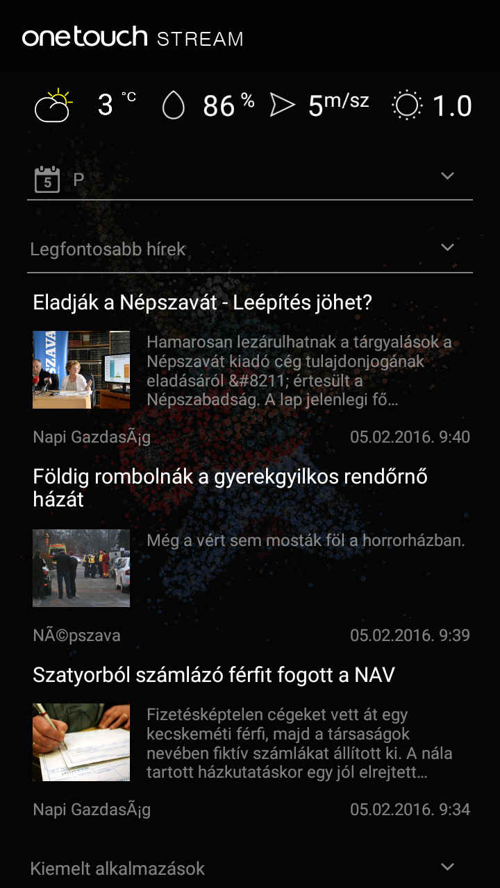Android 6.0-ról vagy Android 5.1-ről egyelőre sajnos szó sincs, vagyis be kell érnünk a nem éppen friss keltezésű Android 5.0.2-es operációs rendszerrel, melynek alapértelmezett felhasználói felületet csak minimálisan módosította a gyártó. A zárolt képernyőről nem egyszerűen csak a telefonos funkciók és a kamera, hanem többek között a számológép, a zenelejátszó és a QR-kód olvasó is villámgyorsan, dupla kattintással elérhető. A fentről lehúzható sávon szokás szerint megtalálhatók a fontosabb információk (dátum, idő, töltöttség), a fényerőállító csúszka és néhány fontosabb beállító gyorsgomb, a kijelző alsó sorában pedig öt ikon sorakozik, és ezek közül a középsőre bökve tudunk a főmenübe teleportálni. Alapesetben három slide között lapozgathatunk a nyitóképernyőn, melyek közül a baloldali a One Touch Stream nevet viseli, és időjárás információkkal, friss hírekkel, valamint alkalmazás és háttérkép ajánlóval szolgál (és kikapcsolható). Hasznos, hogy be lehet állítani, hogy a hírekben csak akkor jelenjenek meg képek, ha azok letöltésére Wi-Fi kapcsolat áll rendelkezésre. Az alapképernyőn akár mappákba is pakolhatjuk az ikonokat, ellenben a főmenüben erre már nincs lehetőség: a 4x5-ös felépítésű menü egyszerű fehér háttérrel rendelkezik és igen puritán megjelenésű. Lefordítással némíthatók a bejövő hívások, a riasztások pedig hasonló módon állíthatók szundi üzemmódra.