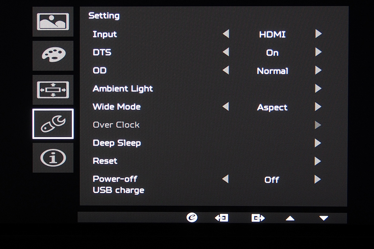 A gombok elég picik, és mi kicsit messzebb tettük volna őket egymástól, de még mindig sokkal jobban használható az interfész, mint az érintős felületek többsége. Az öt gomb segítségével a fontosabb paraméterek (hangerő, játék mód, bemenet) közvetlenül is módosíthatók. PIP és/vagy PbP viszont nincsen, mivel az Acernél úgy ítélték meg, hogy a rendelkezésre álló kettő csatlakozó mellé ezt a funkciót felesleges lenne beépíteni.