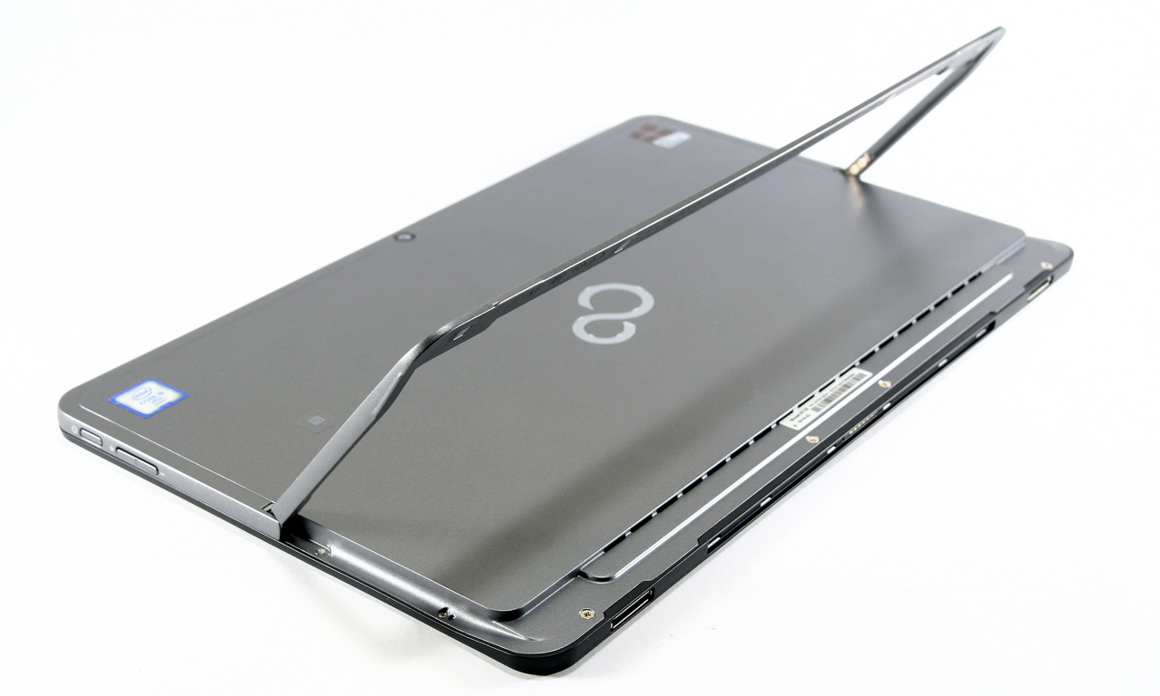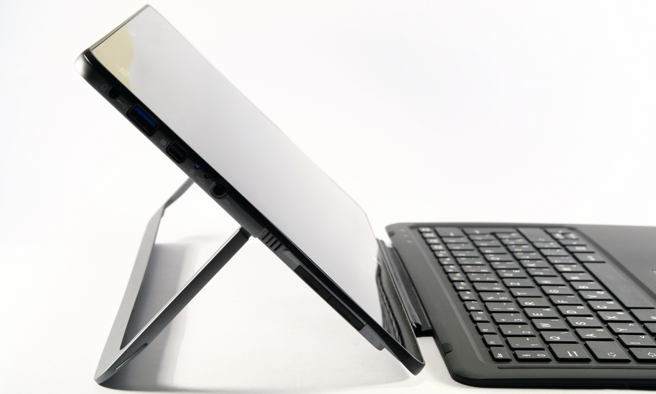 Az R726 alaphelyzetben egy fullextrás, windowsos tablet, mely a gyári alapfelszereltség részét képező billentyűzettel avanzsálhat hordozható számítógéppé. A klaviatúra felapplikálását követően a tömeg 830 grammról 1170 grammra nő, ami még mindig simán vállalható érték, sőt! A két fő részegység között egy hat érzékelős interfész tart kapcsolatot, a könnyű csatlakoztathatóságról, illetve szétszedhetőségről pedig remek mágneses rögzítési megoldás gondoskodik. Joggal merülhet fel a kérdés, hogy a maximálisan fejnehéz masinát az asztalra letéve mi tartja a kívánt pozícióban? Nos, ebben a hátfalból kihajtható állvány lesz segítségünkre, amelyet maximum 90 fokban lehet kihajtani. Csak ilyenkor, vagyis az állvány felhajtását követően látszik, hogy a készüléken egy rejtett microSIM- és microSD slotot is elhelyeztek a tervezők. Előbbi révén villámgyors LTE mobilnettel kényeztethetjük magunkat, utóbbiba pedig maximum 128 GB kapacitású memóriakártyákat csúsztathatunk be.