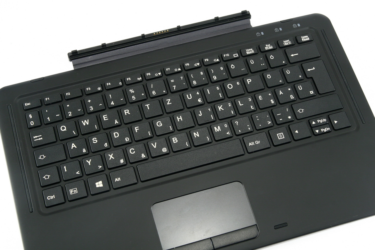 A 340 grammos magyar nyelvű billentyűzet szupervékony kivitelű, így a fémházas készüléktől eltérően enyhén csavarodásra hajlamos. A matt hátlap miatt az idő előtti összepiszkolódástól nem kell tartanunk, háttérvilágítás viszont nincsen. A 79 darab kellemes nyomáspontú gomb 27×10 centiméteres felületen osztozik egymással, közöttük pedig 3 milliméteres térközök találhatók, tehát az ergonómia a 12,5 colos kategóriát tekintve teljesen korrekt. Az alsó szekciót uraló trackpad 8×4 centiméteres felületen várja ujjaink érintését, alatta pedig jól elkülönített formában sorakozik a szokásos két nyomógomb. A billentyűzet csatlakoztatása, illetve leválasztása automatikusan kiválthatja az operációs rendszer hagyományos/táblagép üzemmódjai közötti váltást, ami persze bármikor könnyen kikapcsolható, illetve manuálisan is előidézhető.