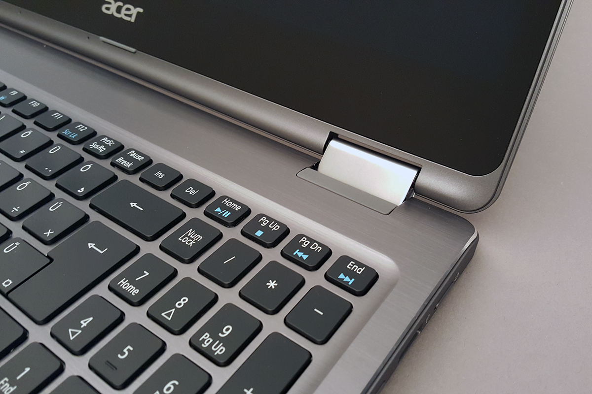 A gép fedlapja alumíniumból készült, de a minőségi anyaghasználat nemcsak itt, hanem minden apró részletnél megfigyelhető – még azokon a helyeken is, ahol műanyagot kapunk, mivel az Acer ezúttal nem a legolcsóbbnak kinéző plasztikra szavazott. A kijelzőt ennek ellenére kicsit be lehet nyomni hátulról, ha nagyon akarjuk, de normál használat közben ebből senkinek sem lesz problémája.