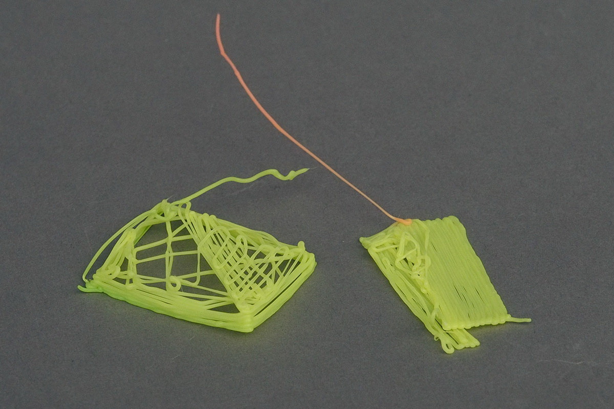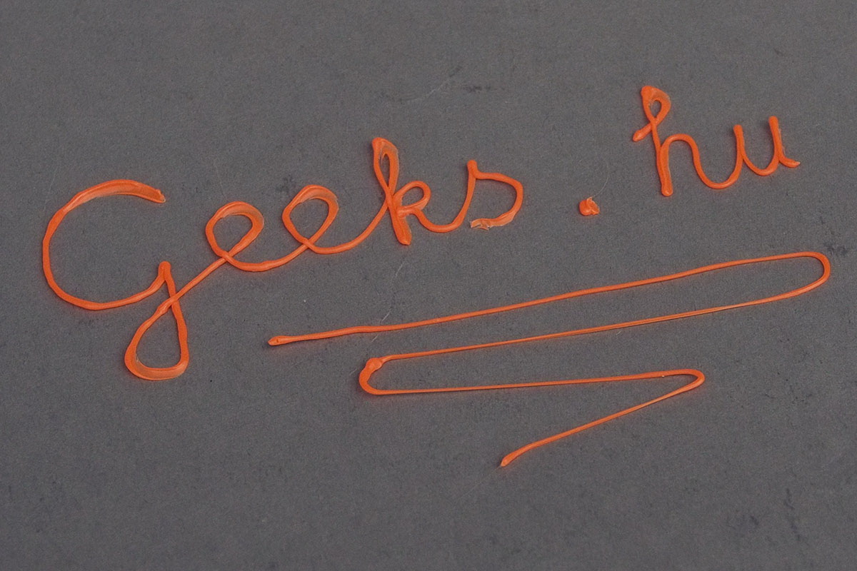 Bekapcsolás után a toll hátsó részén lévő lámpa pirosra vált, ha megtörtént a felfűtés, akkor pedig kékre. Először nyilván érdemes a lassabb sebességet próbálgatni, már csak azért is, mert a nyomtatás vastagságát a toll mozgatásának sebességével tudjuk szabályozni. Arra mindenki gyorsan rá fog jönni, hogy hibázni nem lehet: mire megállítanánk a nyomtatást, addigra már rég kifolyt egy csomó felesleges műanyag, jó eséllyel pont a legrosszabb helyre. Ha valamit lehet, akkor azt érdemes darabokból (mondjuk oldalakból) elkészíteni, az olvadt műanyag ugyanis a meglévő elemek összeragasztására is kiválóan alkalmas. Fontos megfelelően előkészülni is, vagyis mindig tudni kell, hogy merre szeretnénk haladni – ha út közben állunk meg gondolkozni az irányon, az már régen rossz. A további trükkökre is használat közben lehet a leggyorsabban rájönni – például arra, hogy a nagyobb felületeket mindenképpen érdemes inkább két vékony rétegben elkészíteni, és a rétegeknél a szálirányt variálni, mert egy sima „kerítésnél” a teherbírás nem lesz túl nagy. Érdemes kezdetben mondjuk írott szövegel próbálkozni, mert így gyorsan rá lehet érezni arra is, hogy a különféle íveknél valamint az eltérő irányú mozgásnál hogyan változik a lenyomat. És persze azt is meg lehet tanulni, hogy a levegőben milyen hosszú csíkokat lehet húzni – a tapasztalat szerint 3-4 cm-es szálak még teljesen stabilak tudnak lenni, ha biztos kézzel mozgatjuk a ceruzát. A csomagban lévő ABS gyorsan, pár másodperc alatt megszilárdul.
