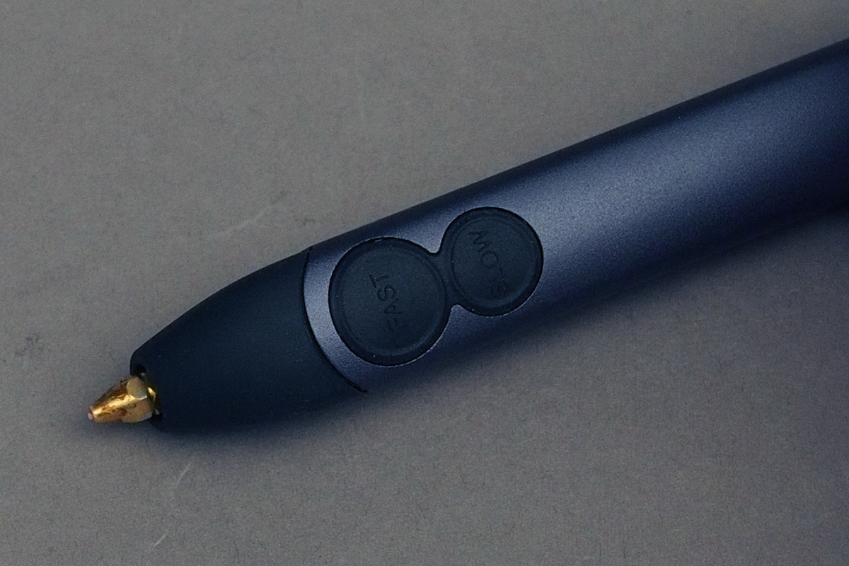 Természetesen a toll hegyénél találjuk a nyomtatófejet, felette pedig két gombot, amivel a nyomtatás sebességét tudjuk szabályozni – illetve ez így azért nem teljesen pontos, a nyomtatási sebesség nem változtatható, a két gombbal csak azt adhatjuk meg, hogy az alapanyag gyorsan vagy lassan távozzék. A nyomtatás sebességét saját kezünkkel szabályozhatjuk: rajtunk múlik, hogy egységnyi idő alatt hosszú vékony vagy rövidebb de vastagabb „vonalat” húzunk. A gombokkal szemben egy apró ablakot találunk, ezen keresztül látjuk, amikor a nyomtatáshoz használt alapanyag elfogy.