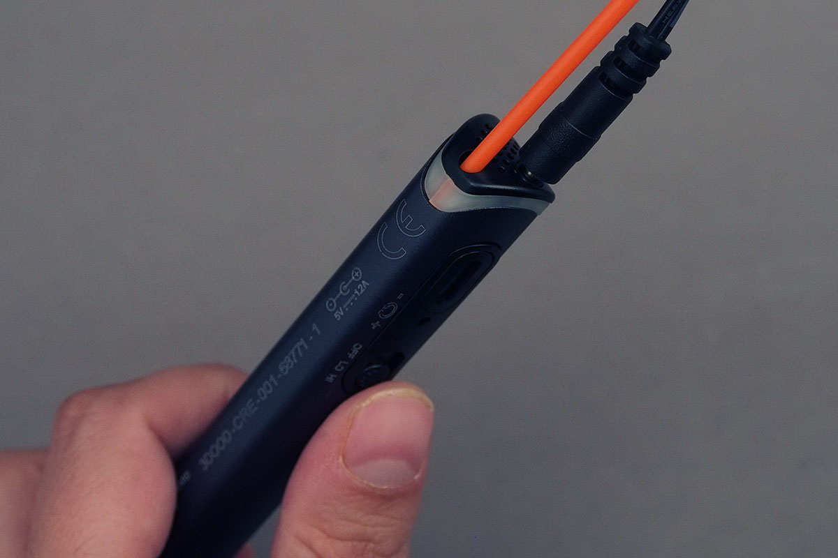 A 3Doodler Create – többek között – ABS-szel, vagyis olyan műanyaggal működik, amelynek olvadáspontja relatív alacsony (220 fok), és amelynek használata nem jár együtt veszélyes gázok keletkezésével. A toll másik végénél találjuk a bekapcsoló gombot, a tápegység pedig a toll hátsó részére került, azzal a nyílással egyetemben, amelybe az alapanyagként szolgáló pálcikákat tudjuk belehelyezni. A gyári csomagban 50 pálcikát kapunk, többféle színben (ez két csomag). Ha később új csomagot vásárolunk majd, összesen 60 féle szín közül fogunk tudni választani (vannak csillogó színek és fluoreszkáló változat is).