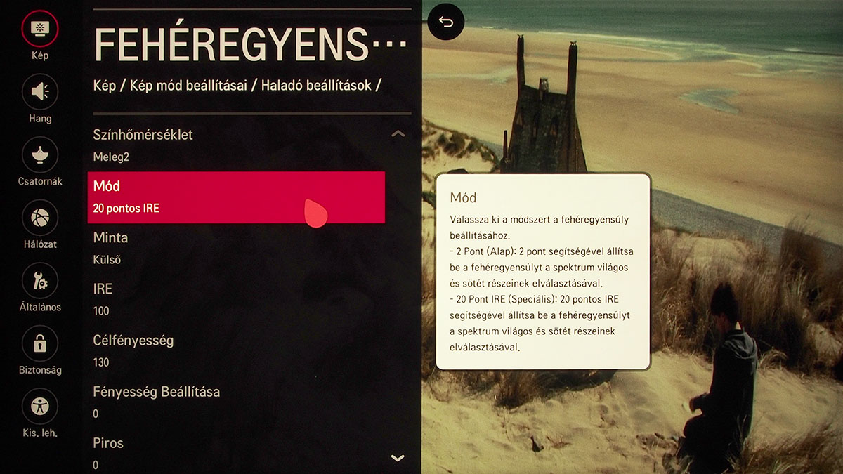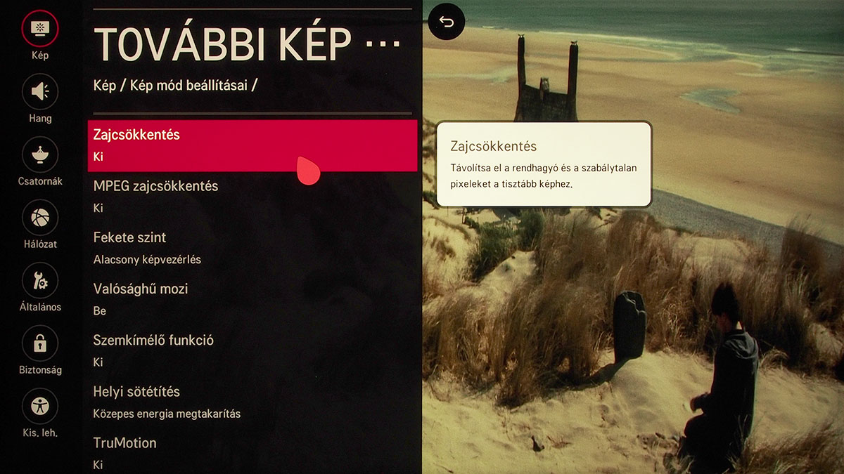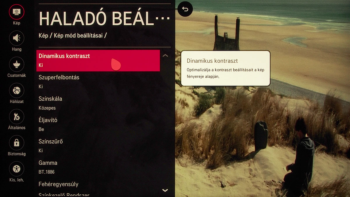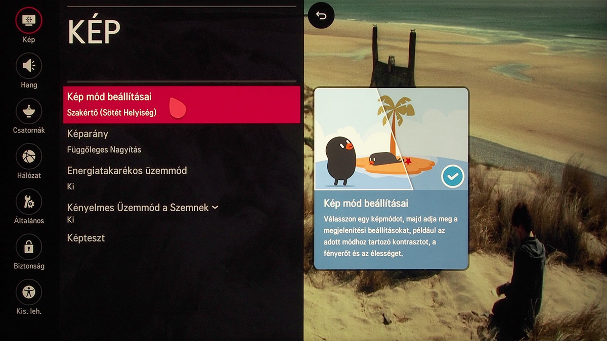 Az LG maradt a jobb oldalt bekúszó gyorsgomboknál, az alkalmazások kártyái pedig továbbra is a képernyő alsó részén jelennek meg. A beállítási lehetőségek tárháza teljes, aki a valamelyik szakértői módot választja, az tényleg minden olyan segítséget megtalál a menüben, amivel a képet a tökéletességig lehet hangolni. Hogy csak néhány dolgot említsünk, a fehéregyensúly beállítása az LG-nél a legrészletesebb, hiszen akár 20 lépcsőben is történhet, a színeket pedig nem három, hanem hat alapszín segítségével pofozhatjuk helyre. A menüben a tájékozódást kis szövegbuborékok segítik, amelyek vagy azt mutatják, hogy a kiválasztott almenüben milyen további funkciókat találunk, vagy a kiválasztott opcióhoz adnak némi magyarázatot.