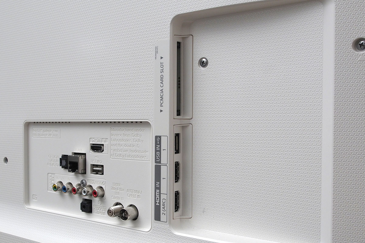 A csatlakozópanel (ha szemből nézzük a tévét, akkor) a bal oldalra került. A felhozatal erős közepes, elsősorban nem az analóg videobemenetek hiánya miatt, hanem azért, mert HDMI-ből csak hármat kapunk. Ebből egyébként kettő néz oldalra egy USB-csatlakozóval és a CI-foglalattal egyetemben, a 3-as számmal jelölt viszont hátrafelé áll. Vele került egy csoportba egy második USB, az Ethernet (de van WiFi is), mindkét antenna csatlakozó (analóg-DVB-T/C és DVB-S) valamint az optikai és analóg (jack) hangkimenet és az egyetlen analóg bemenet, a komponens – szintén RCA hangcsatlakozókkal kiegészülve.