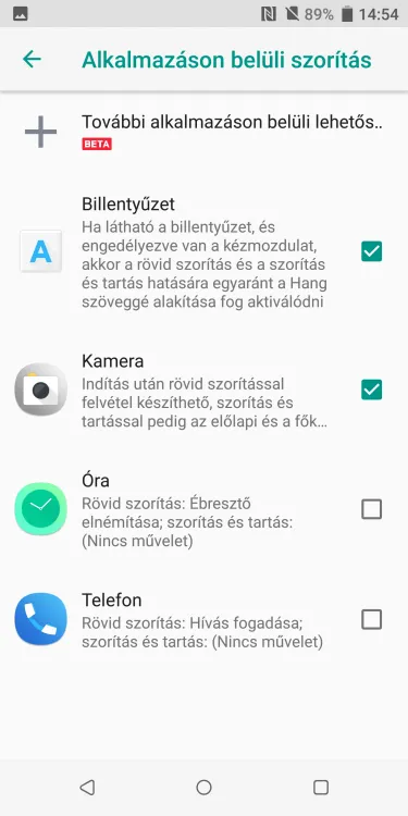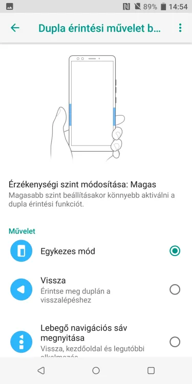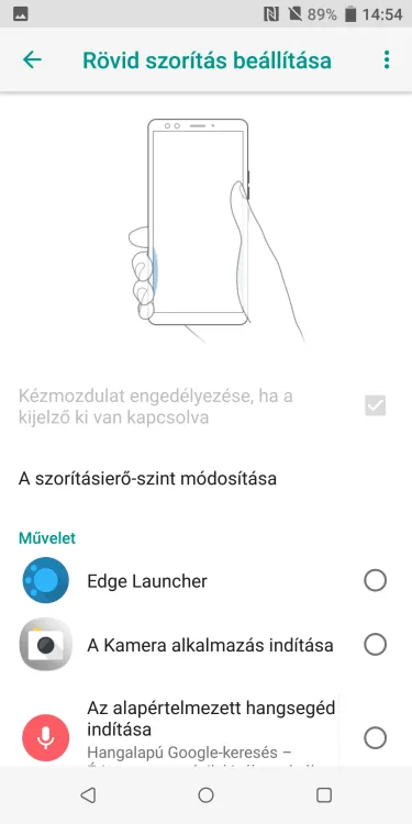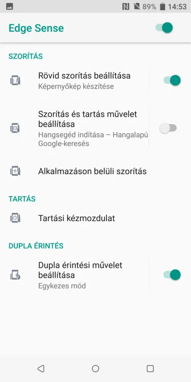 A legnagyobb érdekesség az Edge Sense, amely a telefon oldalának megszorításával aktiválható. A szorítás erősségét egyedileg lehet konfigurálni, és két funkciót is hozzá tudunk rendelni: a rövid és a hosszú szorítással eltérő tevékenységet tudunk indítani. Sok mindent be lehet állítani: elindíthatunk például valamilyen appot (Kamera, Assistant, stb.), de akár azt is kérhetjük, hogy a szorítás a vissza funkciónak feleljen meg. Az Edge Sense annyiban fejlődött, hogy most már alkalmazáson belül is kaphat bizonyos funkciókat – például azt, hogy a billentyűzettel beírt szöveget hanggá alakítsa a készülék. Az Edge Sense további extrája, hogy amikor kézbe fogjuk a telefont, akkor az egyik vagy másik oldal dupla koppintásával is aktiválhatunk valamit – mondjuk az egykezes üzemmódot, a zseblámpát, stb.