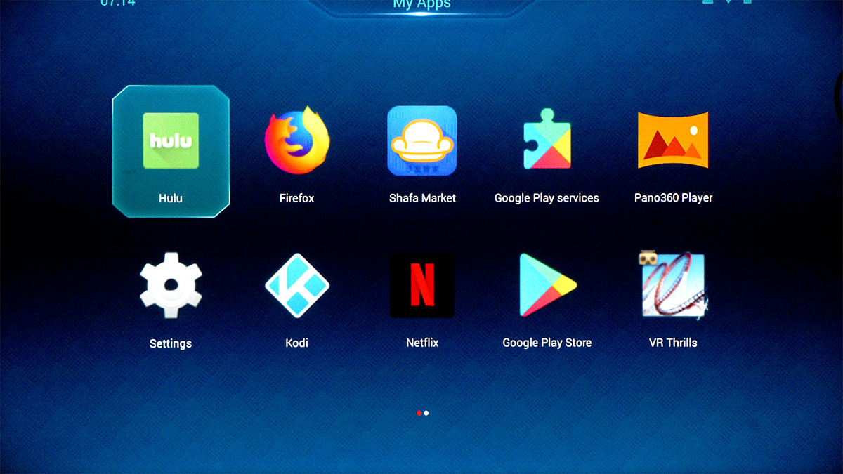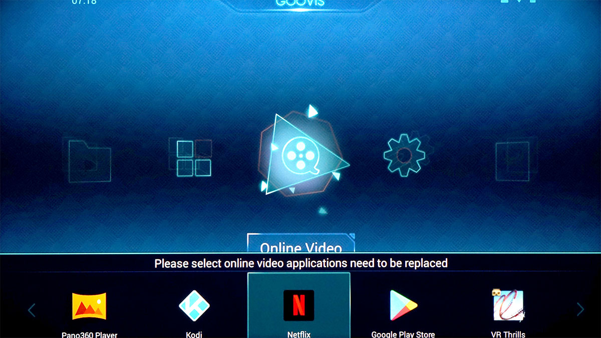 A gyári alkalmazásválasztékban összesen 12 darab appot találunk, de ha ebből levesszük az Androidhoz tartozó, mondjuk így, hogy „funkció nélküli” appokat és a kínai Shafa Market alkalmazásboltot, akkor csak nyolc app marad. Közöttük „igazi” képnézegető nincs is, látszik, hogy a Goovis elsősorban a videókra és a VR-re koncentrált. A lejátszóra másolt vagy külső adathordozón lévő filmekhez a Kodi, online streaminghez pedig a YouTube, a Netflix, az Amazon Prime Video és a Hulut kapjuk, de természetesen semmi akadálya annak, hogy a Play Store-ból feltelepítsük kedvenc lejátszónkat. Ugyanígy a képnézegető pótlása sem jelenthet gondot. A virtuális valósághoz a Pano360 Playert és a VR Thrillst kapjuk, de érdemes itt is ellátogatni a Play Store-ba – már csak azért is, mert rengeteg játékot is letölthetünk. A játékok irányításához Bluetooth kontrollert vagy az USB-re csatlakoztatott vezérlőt is lehet használni. A Goovis Cinego gyárilag telepítve tartalmazza még a Firefox böngésztő is, ha netezni szeretnék.