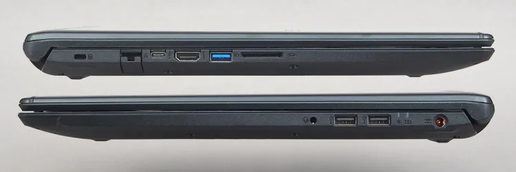 Csatlakozók tekintetében az Acer Aspire 7 a szokásos képet mutatja: bal oldalán (használaton kívül rejtett) Ethernet csatlakozót, USB-C, USB 3.1 és HDMI csatlakozókat valamint kártyaolvasót találunk, jobb oldalt pedig a tápegység csatlakozója, két USB 2.0 csatoló valamint a fülhallgató/mikrofon kombinált bemenete sorakoznak. A csatlakozók a gép hátsó részéhez vannak közel, így az esetleges zsinórok az egerezést egyik oldalon sem zavarják.