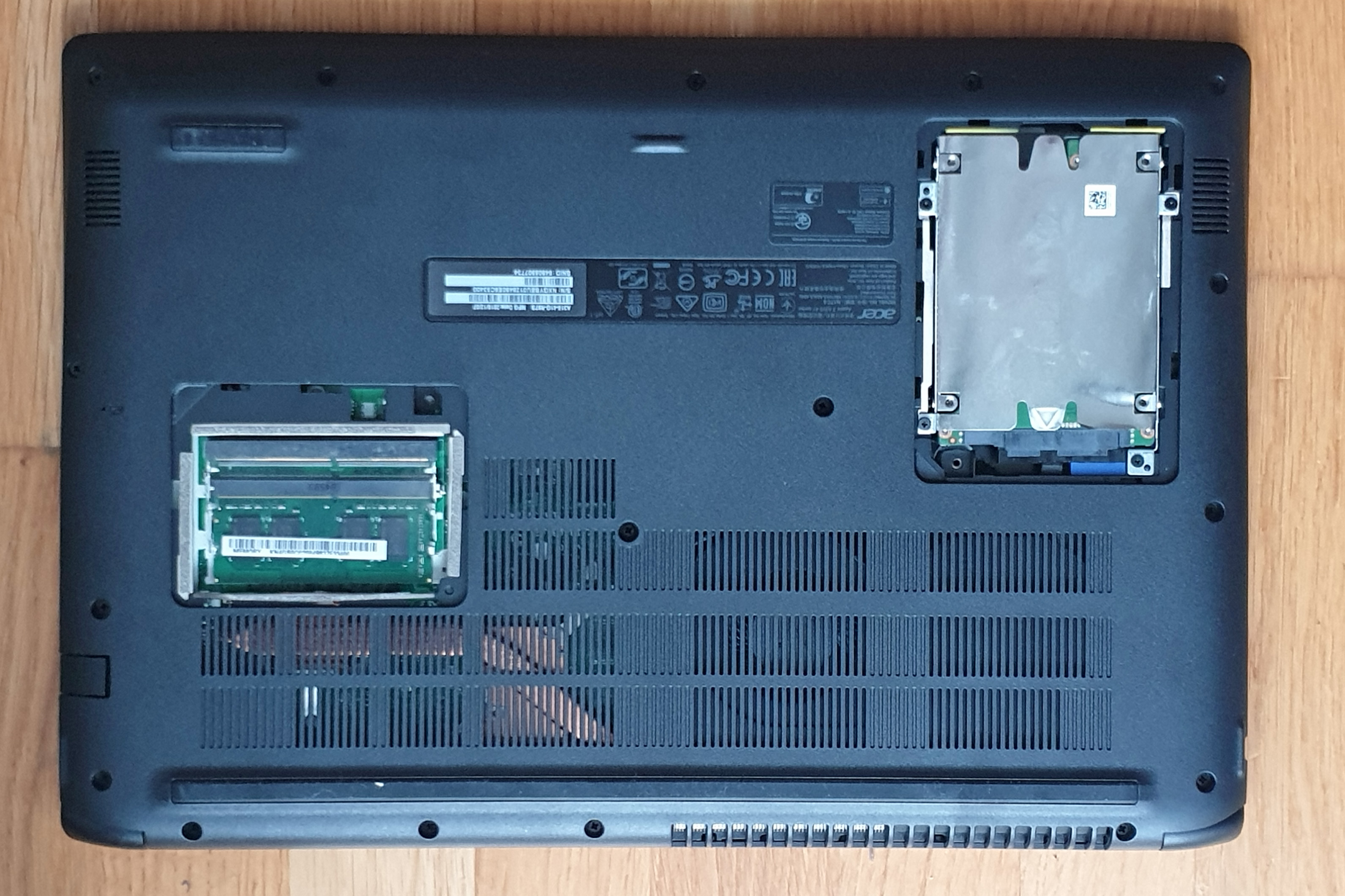 A gépben a memória és a HDD fejleszthető; utóbbi SSD-re is kicserélhető (csak SATA), a memória viszont annak ellenére, hogy csak 4 GB, két modulra van osztva. Vagyis a bővítésnél kettő modul kell venni. A szereléshez nem szükséges a teljes hátlapot levenni, mert van két szerelőnyílás a borításon.