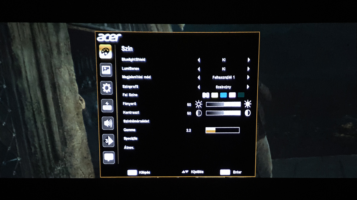 Az elektronika a színárnyalatokkal is jól bánik, az átmenetek szépek, csíkozódás sem figyelhető meg – illetve ha igen, akkor az nem a projektor hibája, hanem a netről letöltött film tömörítéséből adódik. A színkezeléshez tartozik még, hogy van néhány gyári profil, amelyek között lehet váltani, bár ennek csak akkor van jelentősége, ha valaki filmnézés mellett játékokkal is használja a projektort – a fenti értékeket mozi üzemmódban mértük. Ezen kívül az Acer gondolt azokra is, akik a kivetítőt nem vászonnal, hanem simán a fallal használják: ha a fal nem tökéletesen fehér, akkor azt az elektronika a színkeverésnél figyelembe tudja venni.