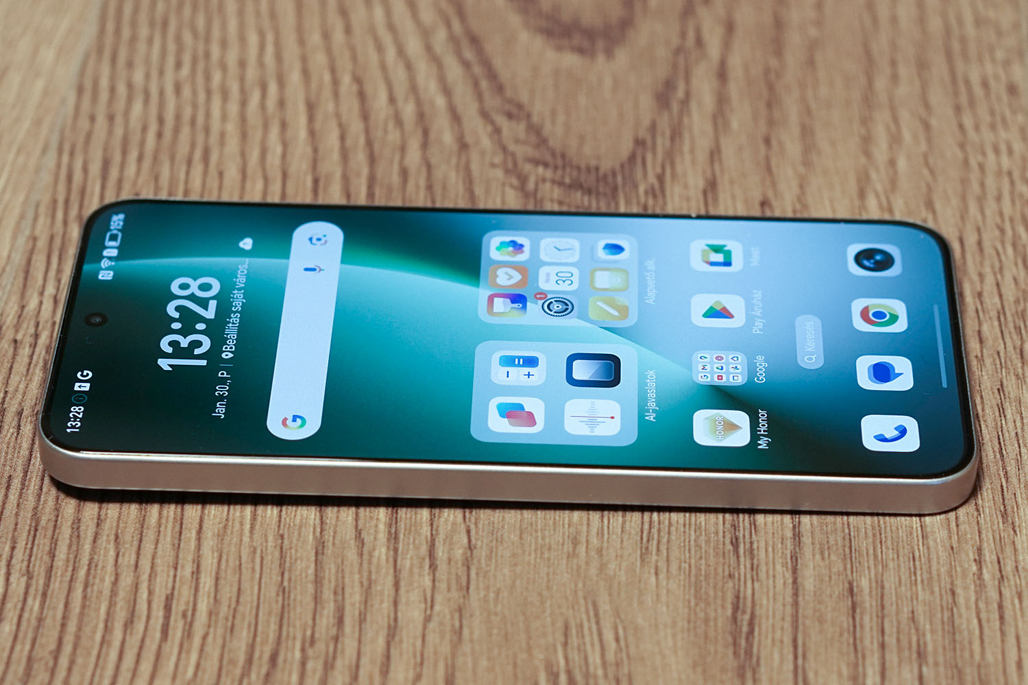 A kedvező árcédula ellenére a kijelzőn a Honor nem spórolt. A 0,01 collal megnövelt képernyő ugyanúgy OLED, mint az elődmodell esetében volt. Felbontása 1200×2640 pixel, ami 20:9-es képarányt jelent. Képfrissítése dinamikusan, az aktuális igények függvényében 1 és 120 Hz között változik. Maga a panel 3840 Hz-es PWM vezérlést használ, így bár villog, ezt gyakorlatilag lehetetlen észrevenni. Legnagyobb fényereje 6000 nit, de ha nem csak a felület 1 százalékát kell kivilágítani, azaz normál körülmények esetén, a 800 nites limit a mérvadó. Ez legalábbis a kézzel beállítható maximum, amit a telefon kültéren 1000 nitel tud megtoldani a jó olvashatóság érdekében. A színek rendben, feltéve hogy az alapértelmezettként beállított Élénk profil helyett a Normál beállítást választjuk ki.