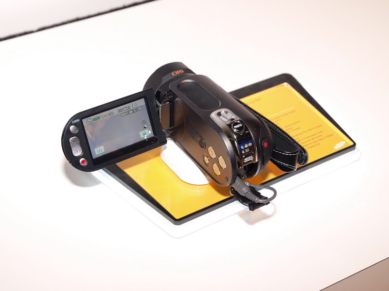 A kézi felvevők tudása az adattároló méretét nem számítva a sorozaton belül teljesen megegyezik, mi a csúcsmodell, HMX-H106-tal ismerkedtünk meg kicsit közelebbről. A kamera a Samsung korábbi dizájnját örökölte, így annak ellenére, hogy alapvetően nem nagy, a hengeres forma miatt éppen kézreáll. A tömege az SSD miatt még tovább csökkent – ez már nem biztos, hogy előny, nagy zoomnál stabilan tartani már az elődöket sem volt könnyű. Szerencsére van optikai stabilizátor, ami a nagy kilengéseket el tudja tűntetni.