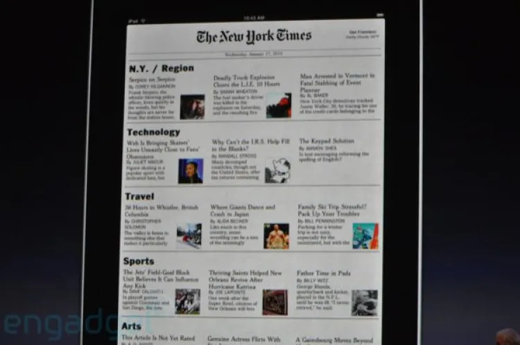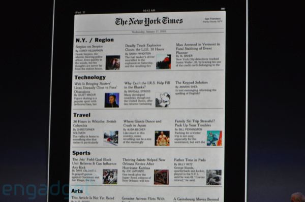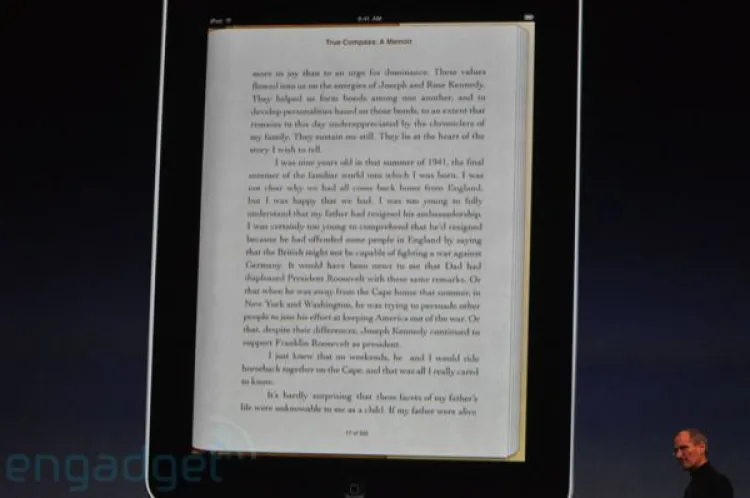 Steve Jobs a kezelőfelületet demózza - az Engadgetnek sikerült is megfigyelnie, hogy a Flash-támogatás most is hiányzik a böngészőből, de ettől eltekintve a készülék remekül használható, mint netes eszköz. A multitouchos érintőképernyővel iPhone-szerűen, gesztusokkal vezérelhető.