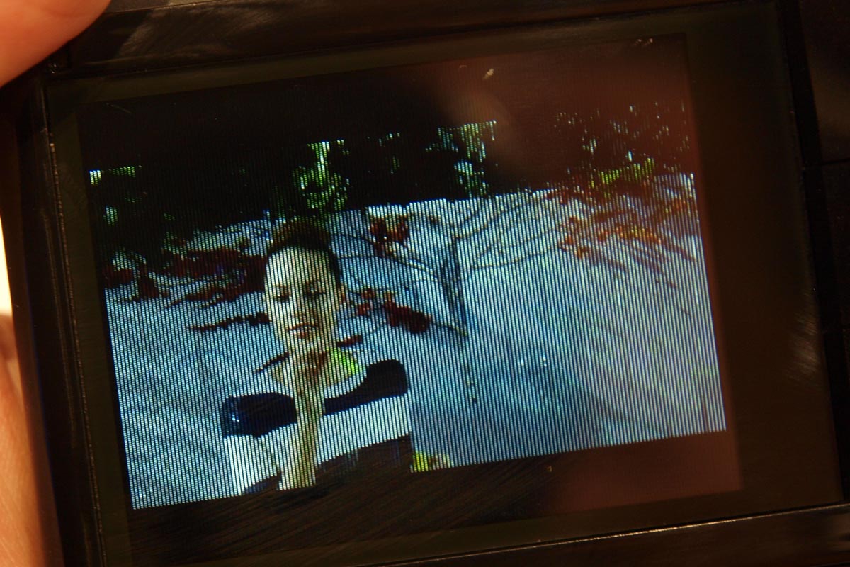 A Bloggie hátlapján egy olyan kijelző van, ami elvileg szemüveg nélkül ad 3D képet, a gyakorlatban viszont 2D-s képet is alig; kivételesen nem a fotó csalóka, két szemmel is pontosan ugyanezt láttuk. A videókat a tévére HDMI kimeneten keresztül küldhetjük ki, PC-re pedig a kihajtható USB segítségével tölthetjük át.