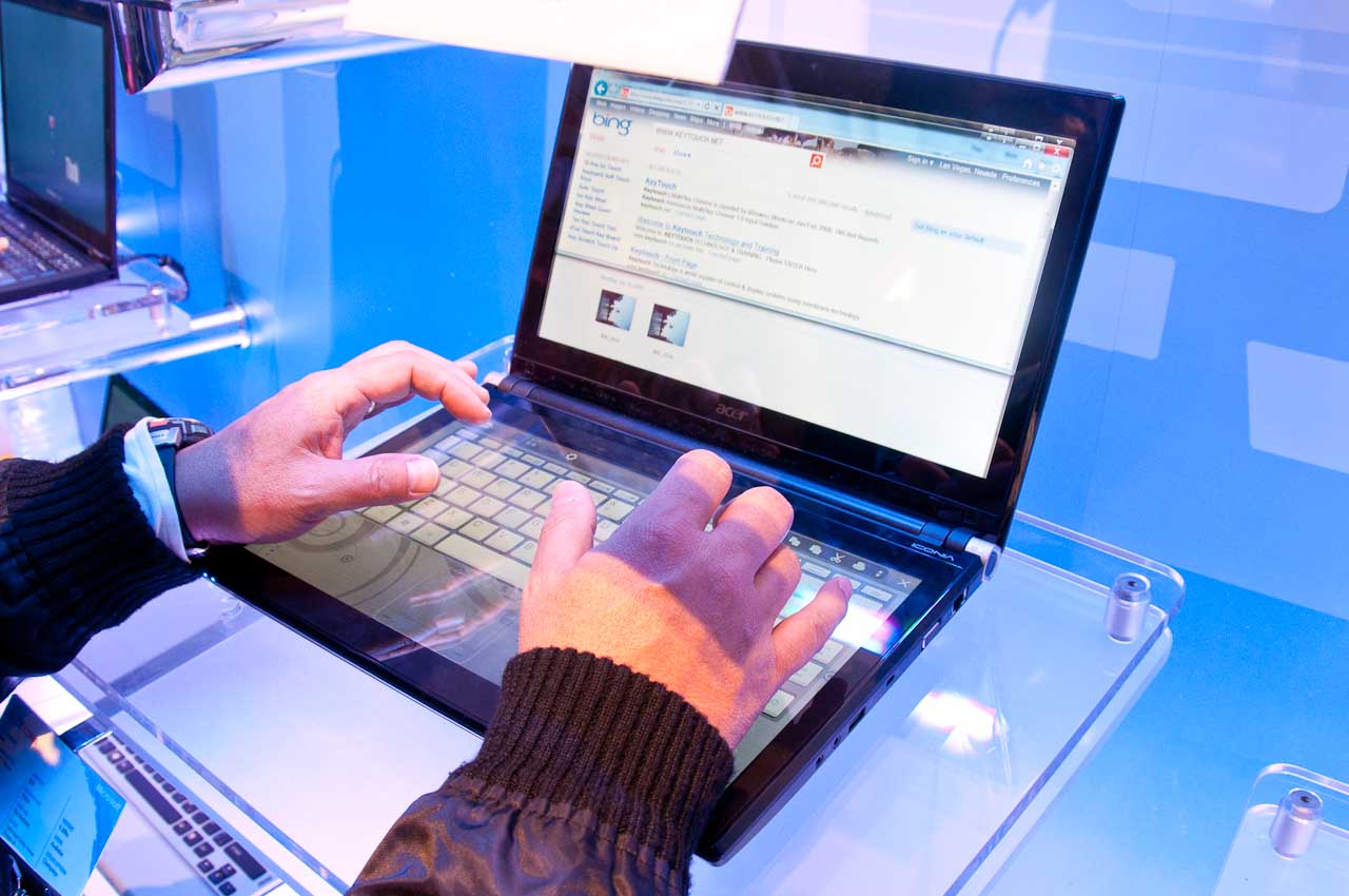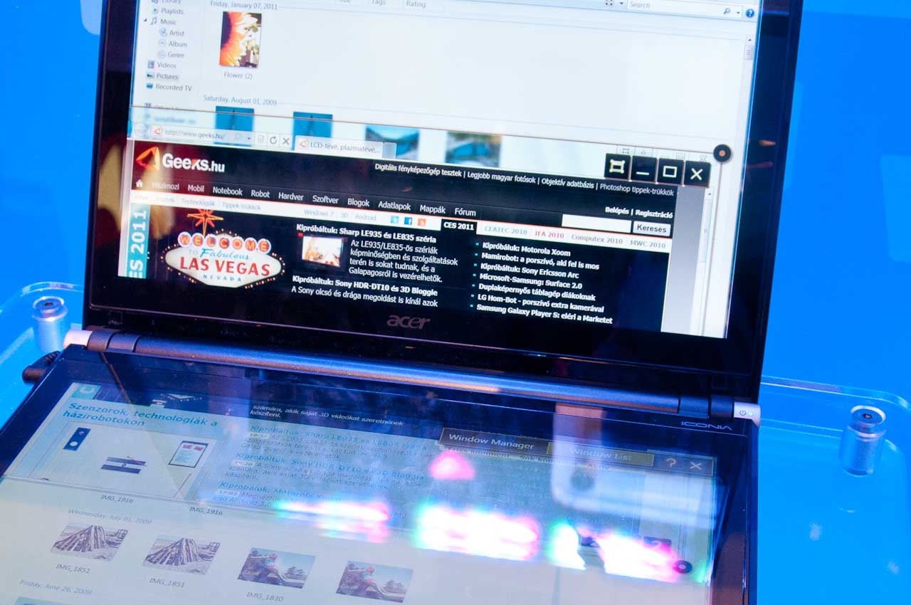 Az Iconia legnagyobb részét természetesen fényes üveg borítja amitől szinte úgy viselkedik, mintha egy nagy tükröt tartanánk magunk elé, ráadásul minden ujjlenyomat azonnal meg is látszik rajta. Mindkét kijelző 14”-os, ami önmagában is garantálja, hogy még akkor is kényelmesen dolgozhatunk, ha az egyiket teljes egészében a virtuális billentyűzet és a tapipad foglalja el (gépelni egyébként könnyű, csak nem kényelmes, mert az üveg hosszabb távú ütögetése elég fájdalmas). Ebben az állapotban egyébként valóban olyan képet mutat az alsó képernyő, mintha egy közönséges notebookunk lenne, csak éppen üveglapok mögött.