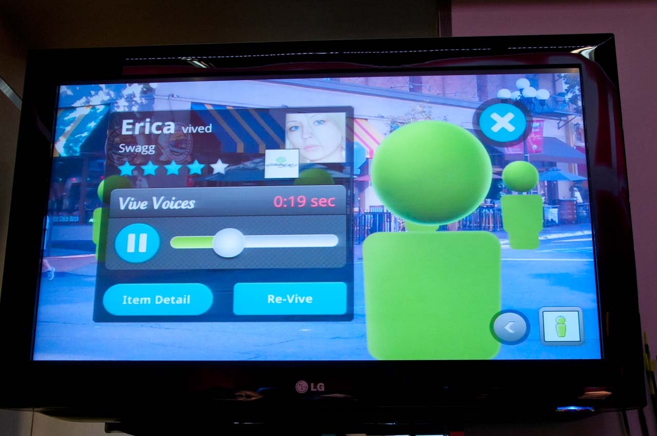 A Qualcomm standján találkoztunk a cég által indított Qualcomm Services Labs segítségével fejlesztett Vive-vel, ami egy helyfüggő közösségi szolgáltatás. A kicsit a Facebook Placesre és Foursquare-re emlékeztető rendszer a kiegészített valóságot (augmented reality) kombinálja a becsekkolásért pontokat adó oldalakkal.