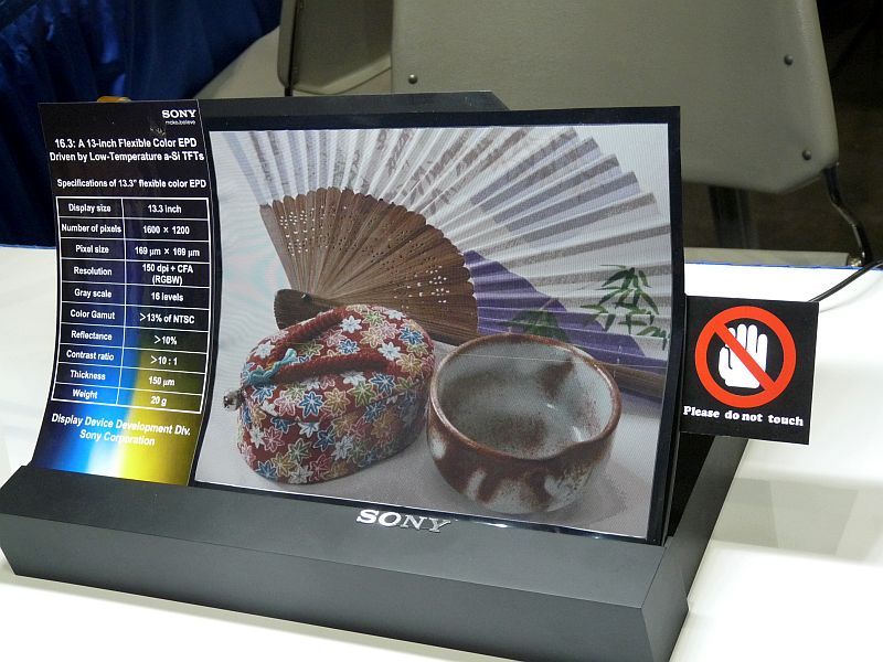 A most bemutatott e-papír prototípus 13,3 colos, felbontása pedig 1200×800 pixel – ez 75 ppi-is részletességnek felel meg, ami nem túl nagy, de számos notebookban is hasonló jellemzőkkel bíró panel van, tehát azért annyira nem is rossz olvasáshoz. A rugalmas fóliára felvitt kijelző 150 mikrométer vastagságú (ez a milliméter kb. heted része), tömege pedig mindössze 20 gramm. Kontrasztaránya igen jó, 100000:1-hez, de a színtéren még van mit javítani, mert a panellel jelen pillanatban az NTSC színtér 13 százaléka fedhető le csupán – bár ez utóbbi adat az e-bookok között nem rossz érték.