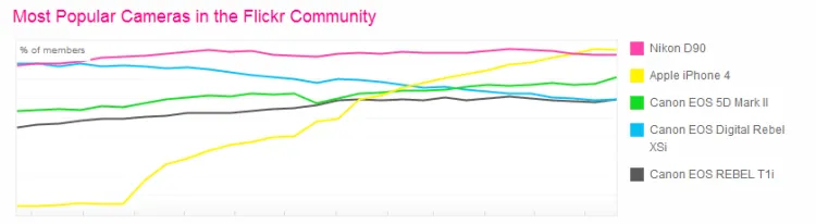 Úgy tűnik, hogy a Flickrre feltöltött képek alapján jelenleg az iPhone 4 a legnépszerűbb képalkotó a felhasználók között. Korábban a Nikon D90-es modellje volt a leggyakrabban használt kamera a képmegosztó oldalon, ezt váltotta most le az Apple okostelefonja.