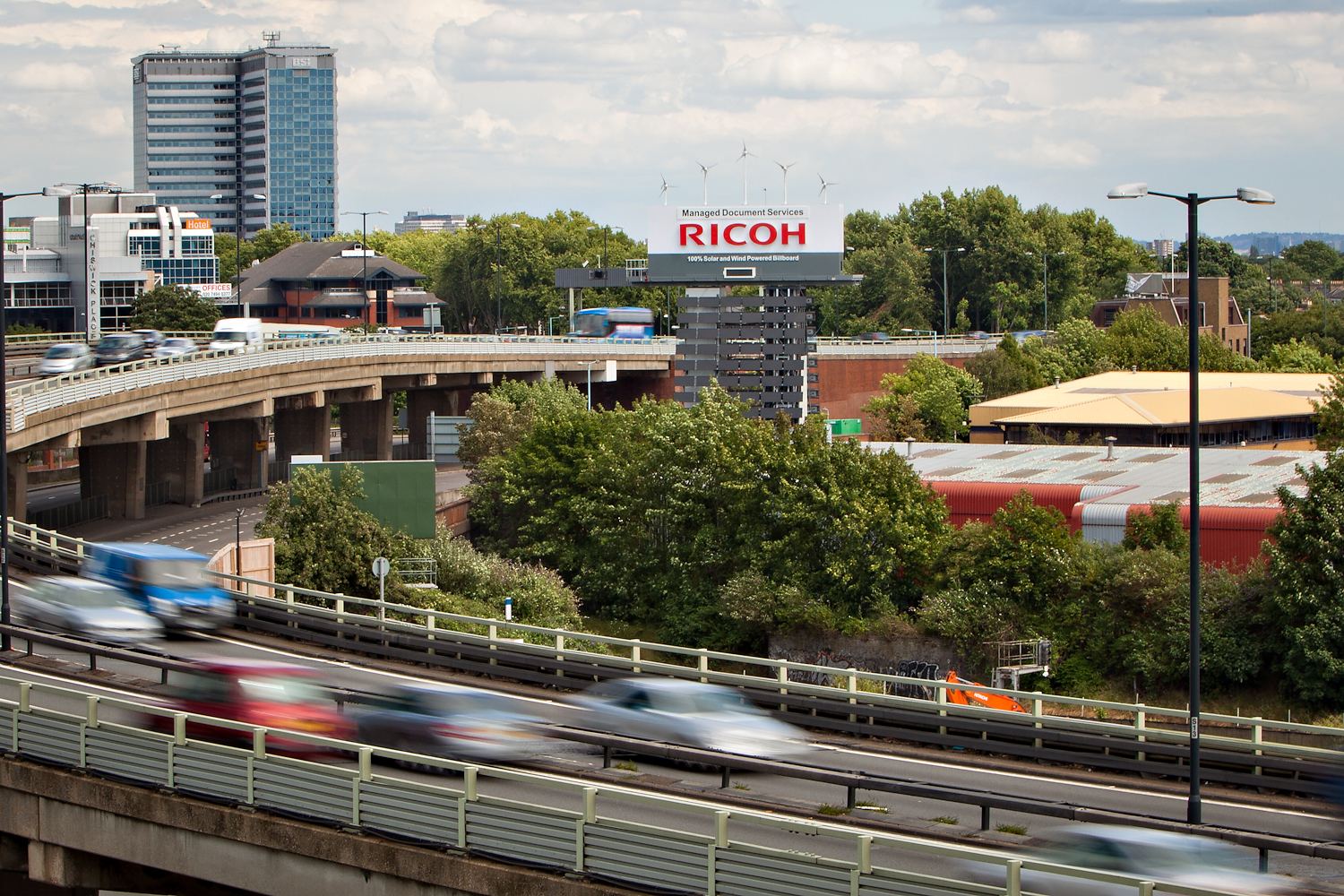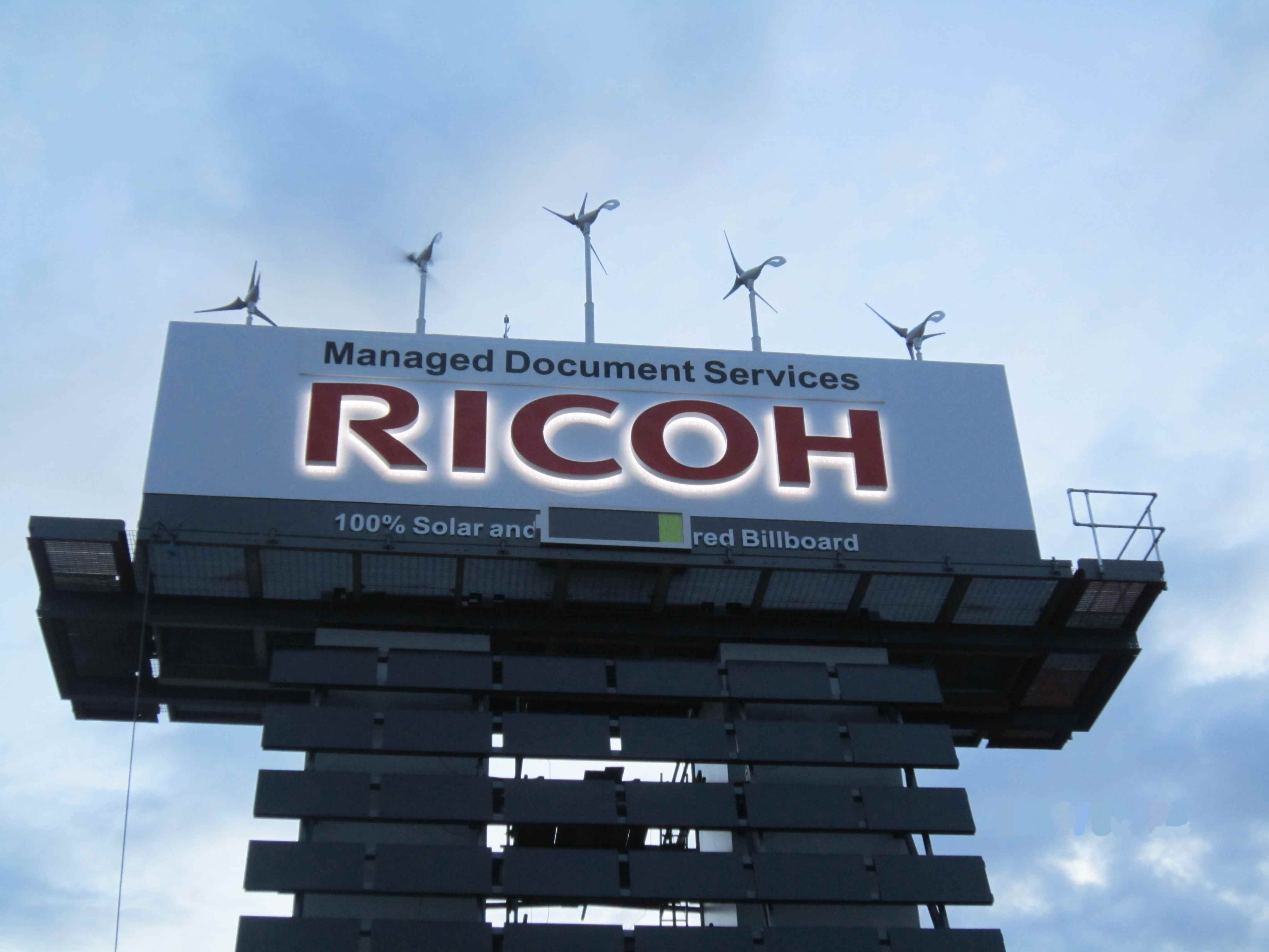 Bár akadnak olyan városok (pl. a CES-nek minden évben helyet adó Las Vegas), amelyek nergiafogyasztása egy kisebb ország energiaigényével vetekszik, egyre több cég figyel oda arra, hogy építkezések, gyártás és szállítás során minél kisebb legyen a környezetre gyakorolt káros hatás. A Ricoh ezt a szemléletet gondolta tovább egy londoni hirdetőtábla üzembe helyezésével, amely kizárólag szélenergia és napenergia segítségével működik. A hirdetésen a Ricoh márkajelzése (neve) olvasható, éjszaka kivilágítva – feltéve, hogy a szélerőművek és a napelem segítségével a rendszer elegendő energiát tudott összegyűjteni.