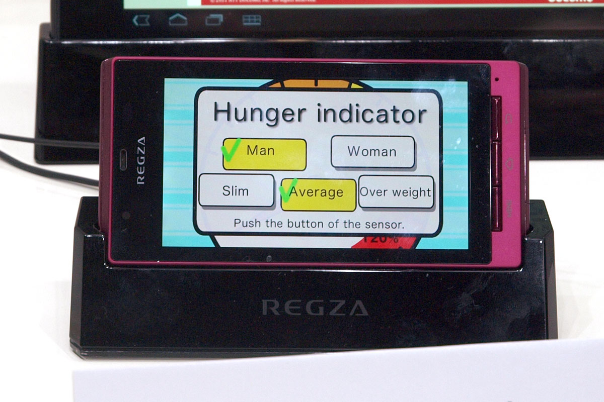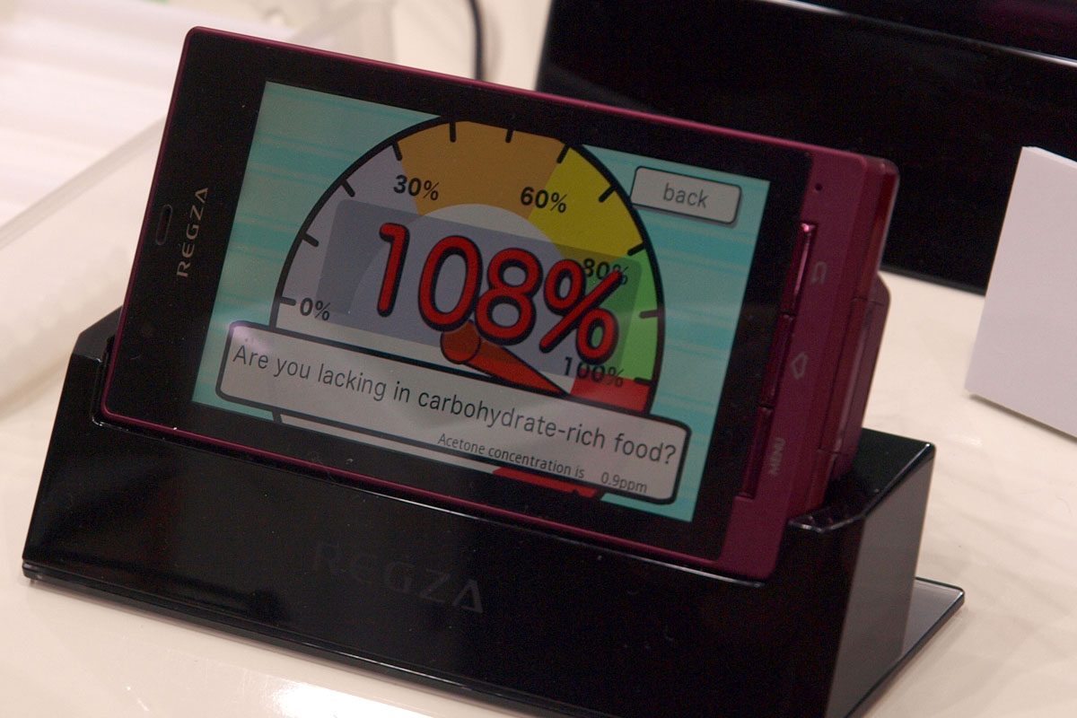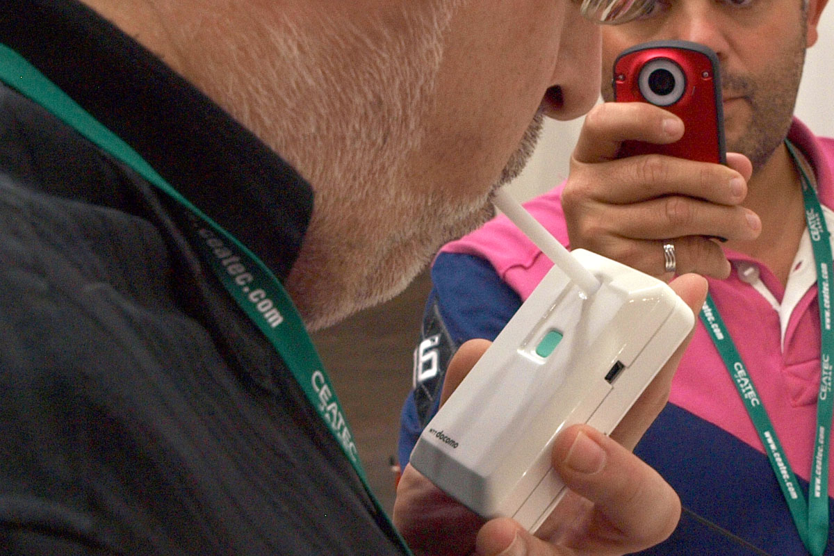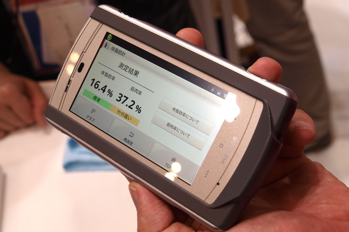 Egy másik tok segítségével a testzsír százalékunkat mérhetjük meg, nemünk, életkorunk és tömegünk beírása után szembesülhetünk a többnyire szomorú valósággal. A repertoárban van még szájszag mérő (randi előtt érdemes használni) és radioaktív sugárzást mérő modul is – utóbbi működésének bizonygatásra pedig még egy kis radioaktív kavicsot is hoztak az NTT DoCoMo munkatársai a standra (0,2 mSv/óra, tehát elméletileg ártalmatlan sugárzással).