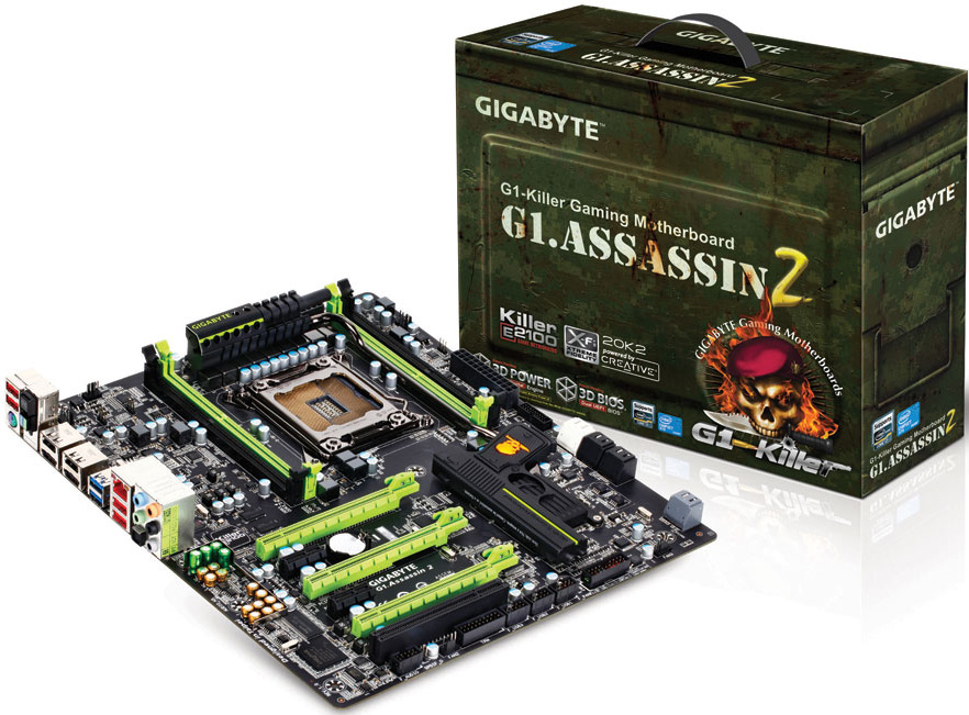 A Gigabyte két oldalról közelítette meg az X79-es platformot. Az egyik oldalról a felsőkategóriás G1.ASSASSIN2 alaplap támad, amely zöld-fekete slotjain kívül fegyver formájú chipset hűtésével is kitűnik a mezőnyből.
