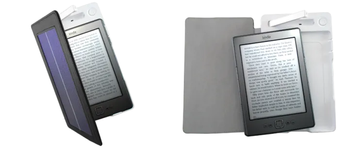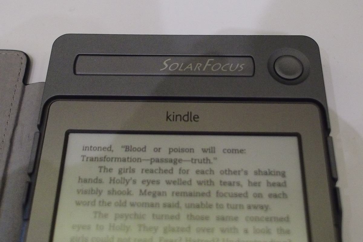 Erre a felismerésre épül a SolarFocus által gyártott SolarKindle nevű Kindle-tok is, amelynek külső borítójába építettek napelemeket. Ezek a gyártó állítása szerint egy órányi napsütést három órányi olvasásra elegendő energiává tudnak konvertálni, amelyet nemcsak a Kindle saját akkumulátorában, hanem a tokban található 1500 mAh-ás második akkuban is tárolhatunk. Az utóbbi az olvasó mellett a tokba épített LED-es lámpát is táplálja, így sötétben is tudunk majd olvasni. Rögtönzött tesztünkből sajnos azt kellett megállapítanunk, hogy a Kindle alsó részét már nem világítja meg elég jól az egyetlen fényforrás, ami elsősorban annak köszönhető, hogy a LED lapos szögben világítja meg az E Ink felületet.