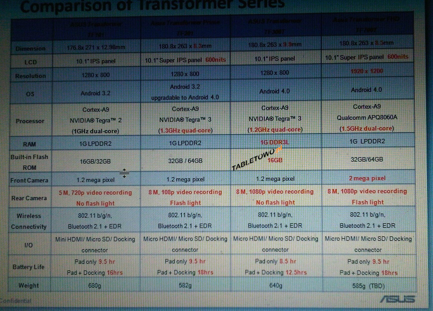Korábban az elsők között számoltunk be arról a két képről, amelyen állítólag az ASUS új tabletje található. A gépről szinte semmit sem lehetett tudni, csak azt, hogy neve TF300T lesz. Most viszont egy lengyel oldalra kikerült az ASUS egy összehasonlító táblázata, amely négy Transformer tabletet tartalmaz, a TF101-et, a TF201-et, a TF300T-t és a TF700T-t.