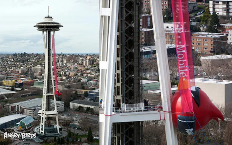 Bár könnyű megjósolni, hogy valódi gumiszalag esetén madarunk a seattle-i Space Needle aljába csapódik majd be, azért mindenképpen impozáns a próbálkozás, ami persze egy reklámkampány része.