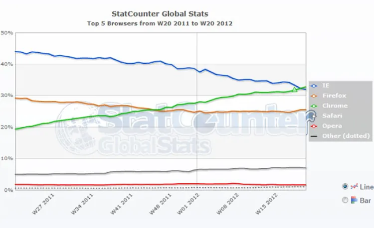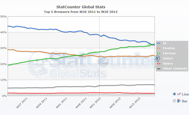 Már az év eleji statisztikai adatok alapján könnyen meg lehetett jósolni, hogy a Chrome 2012-ben felérhet a csúcsra; a 2008 szeptemberében történő bemutatkozását követően három és fél év alatt a StatCounter adatai alapján az Internet Explorert is beérte a Google böngészője, amely ezzel a legnépszerűbb is lett a világon. Ugyan a W3Counter szerint még mindig az Internet Explorer vezet, előnye kevesebb, mint 3 százalék, a Chrome pedig folyamatosan zárkózik fel – így a Microsoft böngészője hamarosan, valószínűleg három hónapon belül, a W3C adatai alapján is a második helyre szorul vissza.