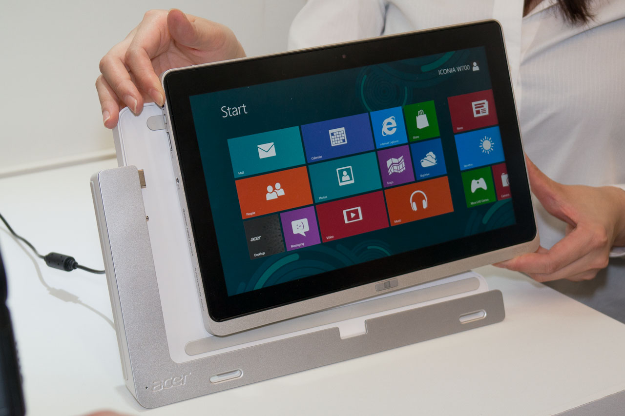 Az Acernél idén a Windows 8-on, és az általa hozott új, érintésérzékeny eszközöket is támogató interfészen lesz a hangsúly. A most bemutatott öt újdonság mindegyikén a Microsoft új operációs rendszere fut. Az első a W510, ami a W700-as nagytestvérrel együtt a táblagépek sorát gyarapítja. A W510 10,1, a W700 pedig 11,6 colos, az előbbi billentyűzetes dokkolóval, az utóbbi pedig egy asztali tartóval rendelkezik. A W510 érdekessége, hogy a dokkolóba helyezett gép teljesen átfordítható, azaz egy konvertible notebooknak megfelelő eszközt kapunk. A kijelző egyébként IPS panelt használ és 1366×768 pixeles felbontású. Ezek mellett a megszokott kiegészítőket kapjuk, azaz HDMI kimenet, 8 MPixeles kamera, 2 GB RAM és maximum 64 GB flash lehet a táblagépben. A processzorról csak annyit tudunk, hogy x86-os Intel, tehát valószínűleg egy Ivy Bridgre épülő tablethez van szerencsénk.