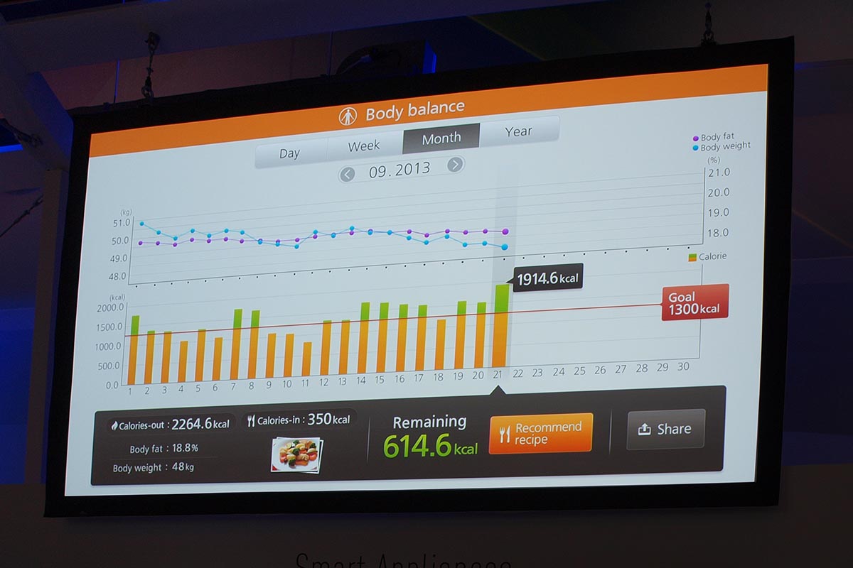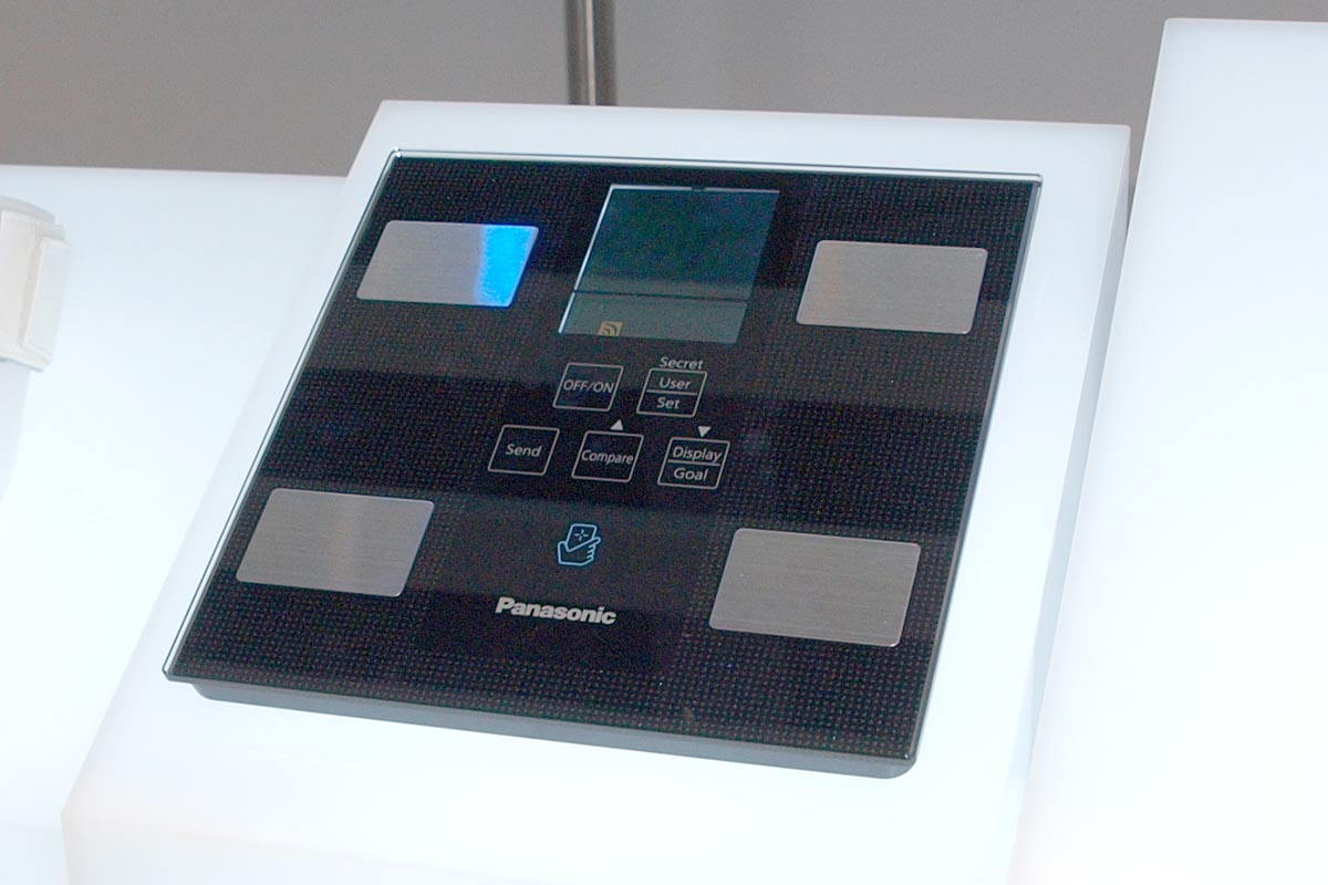 A Panasonic több NFC-s háztartási gépet is bemutatott, volt közöttük légkondícionáló, hűtő, mikrohullámú sütő, mosógép és kerékpáros GPS is. Mindben közös, hogy a telefonos piktorgramhoz érintve a mobilt, a telefon letölti a készülék által gyűjtött működési adatokat, amelyekből aztán a Panasonic szerverei mindenféle érdekes statisztikákat generálnak. A GPS-től például megtudhatjuk, hogy mennyi utat tettünk meg, és milyen sebességet értünk el, közelítőleg akár azt is hogy mennyi kalóriát égettünk el. A mikró és a háztartási eszközök megmondják aktuális fogyasztásukat, a hűtő pedig arra is képes, hogy a letöltött adatokból megtanulja, általában mikor nyitjuk ki este utoljára a hűtőt, és mikor nyitjuk ki először reggel – a két időpont között pedig automatikusan energiatakarékos módra vált. A mérleg méri – többek között – a testzsírszázalékunkat is; ebből pedig adja magát, hogy a rendszer az adatokat össze is kapcsoljhatja, és felhasználhatja például egy fogyókúra program követéséhez, elemzéséhez.