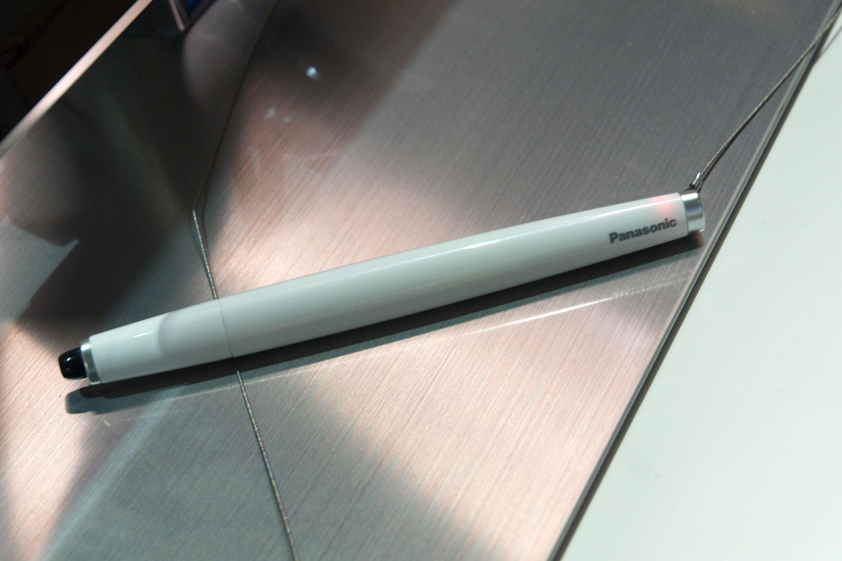 A sajtótájékoztatón figyeltünk fel az elektronikus tollra, működéséről akkor azonban még semmit sem lehetett tudni, ezért elszaladtunk a Pansonichoz, és kipróbáltuk az eszközt. A fehér, meglehetősen vastag stylus vezeték nélkül kommunikál a tévével, legnagyobb érdekessége pedig talán az, hogy a Panasonic összes idén bejelentett Full HD felbontású tévéjével kompatibilis, azaz a ZT60, VT60, ST60 és S60 sorozatokkal egyaránt használható. A digitális toll vége nyomásérzékeny, így lehet vele klikkelni – viszont a „pöcök” csak kétállású, a technológia arra egyelőre nem képes, hogy a nyomás erősségét is érzékelje. A Panasonic hagyományos, kapacitív érintőképernyőt használ, amelyet minden plazmatévé tartalmaz.