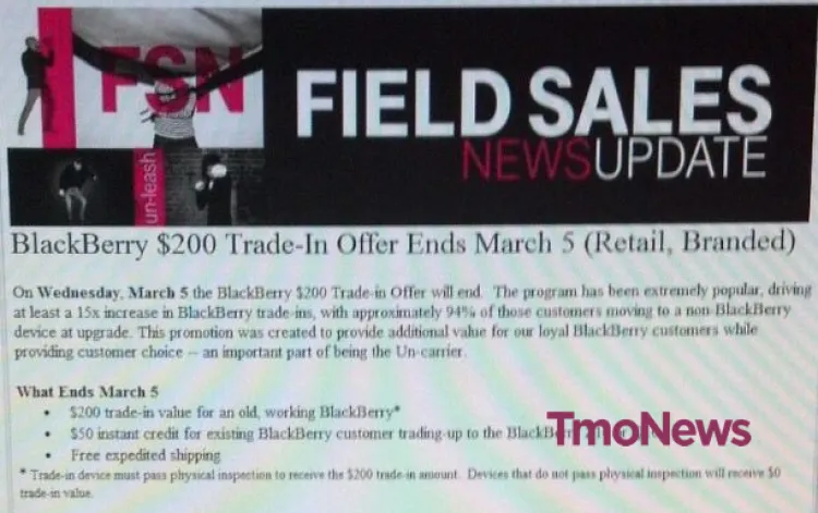 A T-Mobile USA még február 19-én jelentkezett egy olyan akcióval, ahol a régi BB készülékek leadóinak 200 dollárt írtak jóvá az új készülék vásárlásából, feltéve, ha a leadott telefon jó állapotban volt. Az első hirdetések eredetileg még azt hangsúlyozták ki, hogy kedvező áron cserélhetünk BB-t iPhone-ra, de ezen a BlackBerry, mint cég, illetve a platform kedvelőinek felháborodására változtattak, és inkább arra koncentráltak, hogy az új BB Z10-et vagy Q10-et vásárlók a 200 dolláron felül még egy további, 50 dolláros kedvezményt is kapnak.