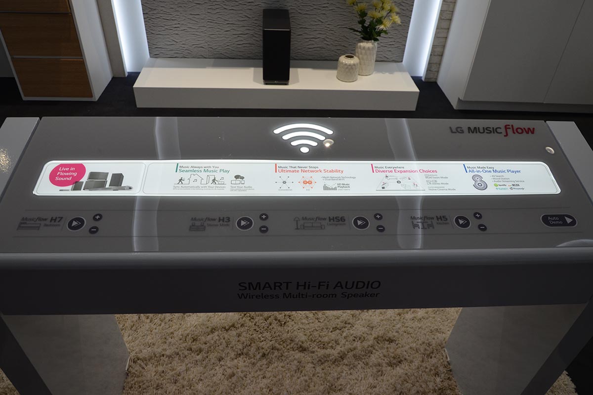 Az LG is rendelkezik néhány WiFi-s vezeték nélküli zenelejátszóval (MUSICflow H3, H5 és H7), amelyeket a vállalat természetesen az IFA-n is mutogatott. Ezek a szokásos módon működnek: Bluetooth vagy WiFi kapcsolat segítségével lehet streamelni a zenét rájuk, az egyes típusuk között pedig az az alapvető különbség, hogy mekkora méretben készülnek és milyen teljesítmény leadására képesek. A legérdekesebb azonban mégis az a „keverőpult” volt, amely a demónak helyszínt adó szobában volt – csak az a kár, hogy ilyen kütyüt vásárolni nem lehet, ha vágyunk rá, akkor legfeljebb saját magunk építhetjük meg.