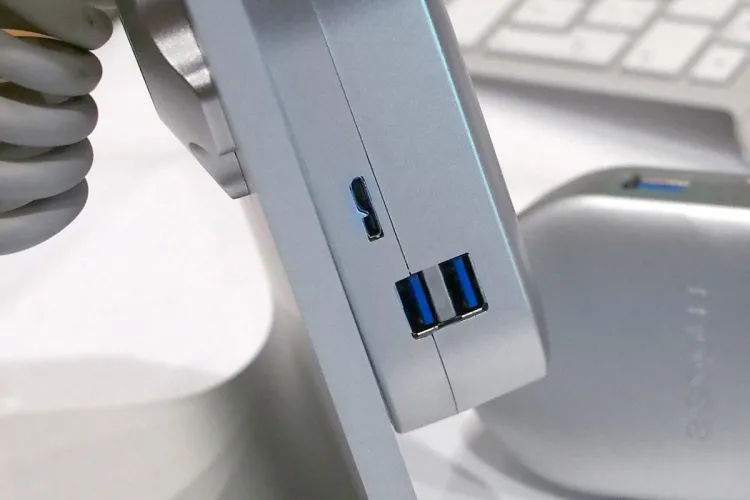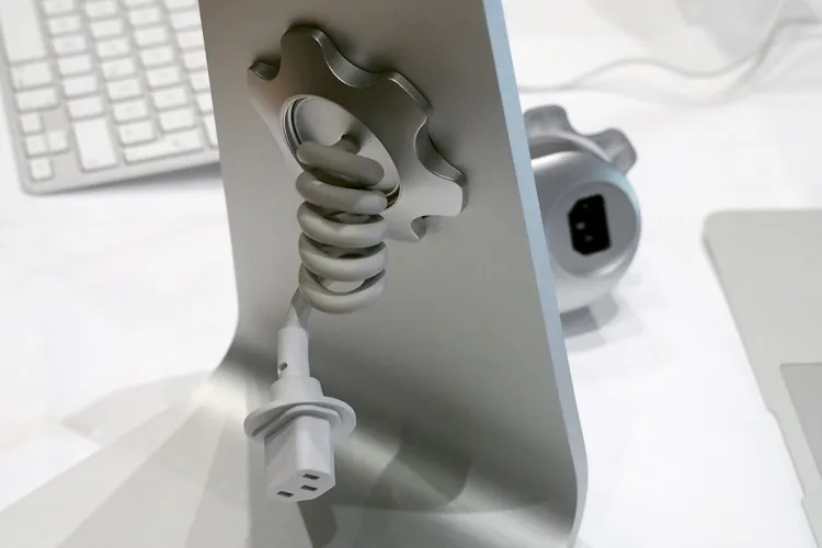 A másik cucc egy több USB porttal rendelkező töltő, ami az iMac állványához passzol úgy, hogy a gép eredeti kábelét kell a töltőbe dugni, ami pedig az állványon található lukba csavarozható. Magán a kütyün egy microUSB 3.0 és négy „sima” USB 3.0 port található, amelyek 2A leadására képesek, és persze az iMactől függetlenül is működnek.
