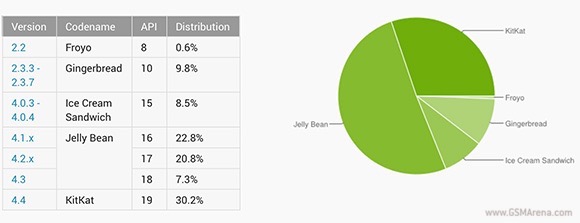 Nehéz sok mindent fűzni az alábbi ábrához, azt viszont mindenképpen megállapíthatjuk, hogy a régi rendszerek a gyárilag nem frissített, illetve nem frissíthető operációs rendszerek miatt még ma is a telefonok közel ötödén működnek – vagyis a Google továbbra is nehezen szabadul azoktól a nem karbantartott készülékektől. A Jelly Bean különféle verzióiból még nagyon sok van használatban, de az előző hónaphoz képest 3%-ot esett ezen verziók együttes részesedése. Az viszont jó hír, hogy a KitKat a telefonok 30%-ára elérhető már – de az sajnos nem, hogy ez ma már nem a legfrissebb, hanem csak a második legfrissebb változat, ugyanis az 5.0-ás Lollipop is elérhető már.