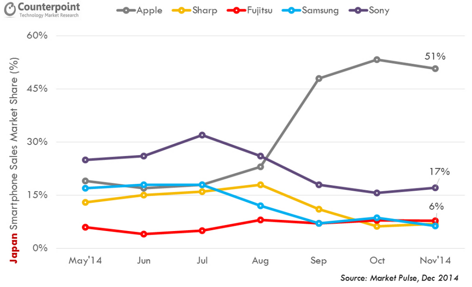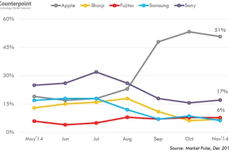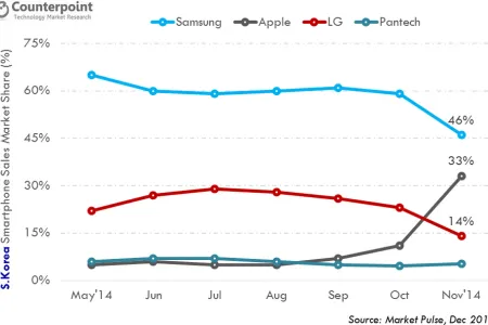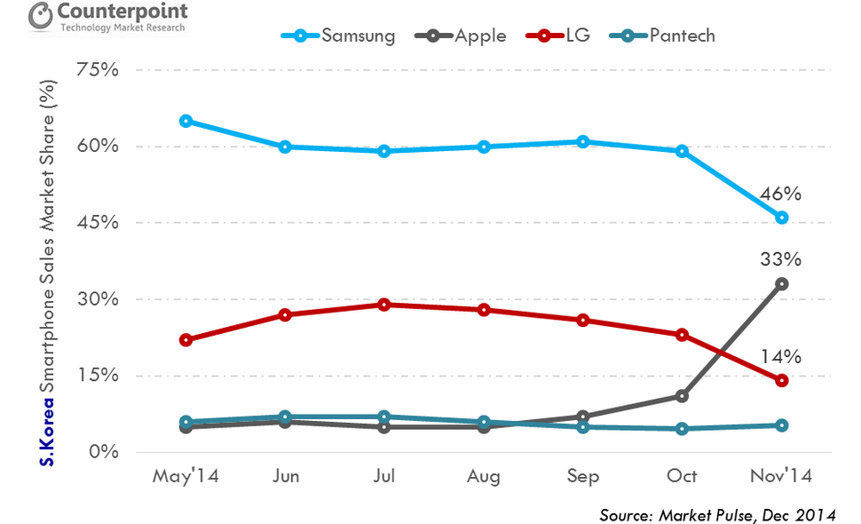 A CounterPoint Research piackutató elemzése alapján a Samsung mostanában néz szembe először saját otthonában a konkurencia fölényével vagy legalábbis annak lehetőségével, az Apple új iPhone 6 és iPhone 6 Plus készülékei ugyanis sokaknak tetszenek. 2014 október-november időszakában az Apple 33%-os piaci részesedést szerzett, növekedése az akkor 46%-ot birtokló Samsung számára veszélyes lehet. Ez ugyanis az első eset, amikor Dél-Koreában külföldi gyártó 20%-nál nagyobb piaci részesedést tudott szerezni.