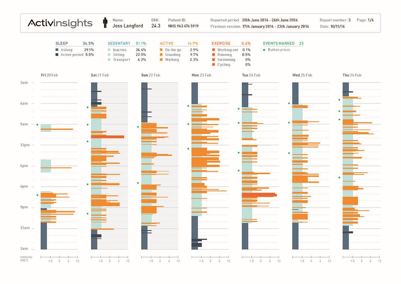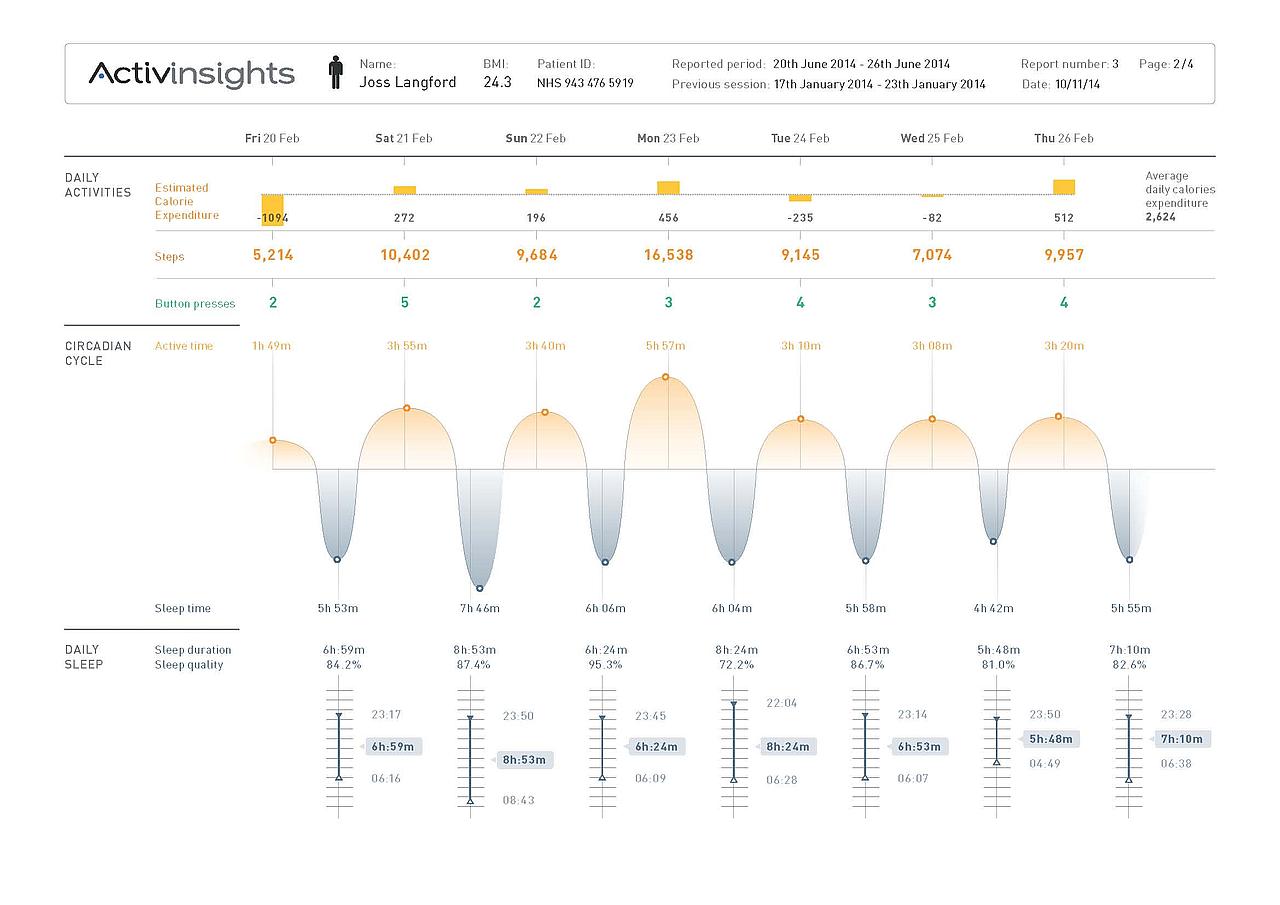 A karpánt oldalán található gombbal bizonyos események (például gyógyszer bevétele) pontos időpontját rögzíthetjük, a hét végén visszakapott egység memóriájában tárolt adatokból pedig az Acitvinsights szolgáltatása egy rendkívül pontos képet fest a páciens mindennapos aktivitásáról.