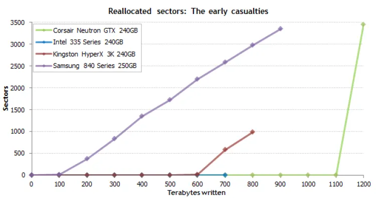 A tesztben a következő termékek vettek részt: Corsair Neutron GTX 240GB, Intel 335 Series 240GB, Kingston HyperX 3K 240GB, Samsung 840 Series 250GB és a Samsung 840 Pro 256GB. Mind tipikus, ma is kedvelt típusok. A Samsung 840 kezdett először hibákat produkálni 100 TB írása után (TLC-s, ez várható volt), tönkre pedig 900 TB után ment. Az Intel 700 TB után egyszer csak nem volt hajlandó többet írni, a hibát előre nem jelezte. A Kingston HyperX 3K 600 TB után bírta 800 TB-ig, a Corsair meghajtója 1,1 PB után még 100 TB-ot volt hajlandó írni. Mivel a SandForce chipset tömöríti az adatokat a kevesebb adat írásának érdekében, egy másik Kingston HyperX 3K-val tömörítetlen adatokat írtak. Az 900 TB után jelzett hibát, de 2,1 PB után ment tönkre. Ez is azt mutatja, hogy két, akár azonos gyártósoron, azonos technológiával készült meghajtó között is lehet eltérés az élettartamot tekintve.